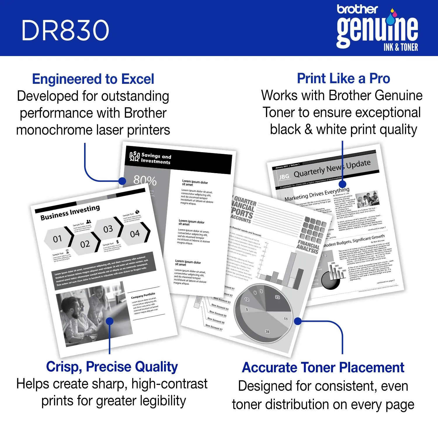 Print confidently and help optimize Brother multifunction and allinone Brother Monochrome Black White Laser Printer performance with a Brother Genuine DR830 Drum Unit. Longlasting Drum Unit works with Brother Genuine Toner cartridges to create professionallooking prints with even, consistent toner distribution on every page. Yields up to 15,000 pages1 .