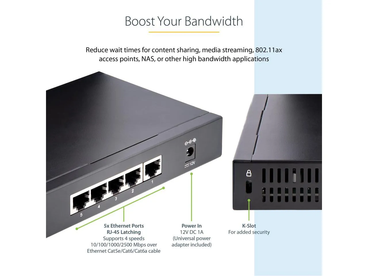 The Startech 5-Port 2.5G Unmanaged Gigabit Switch is designed to elevate your network's performance with seamless 2.5GBASE-T support. Easily connect multiple devices while benefiting from enhanced data transfer speeds.