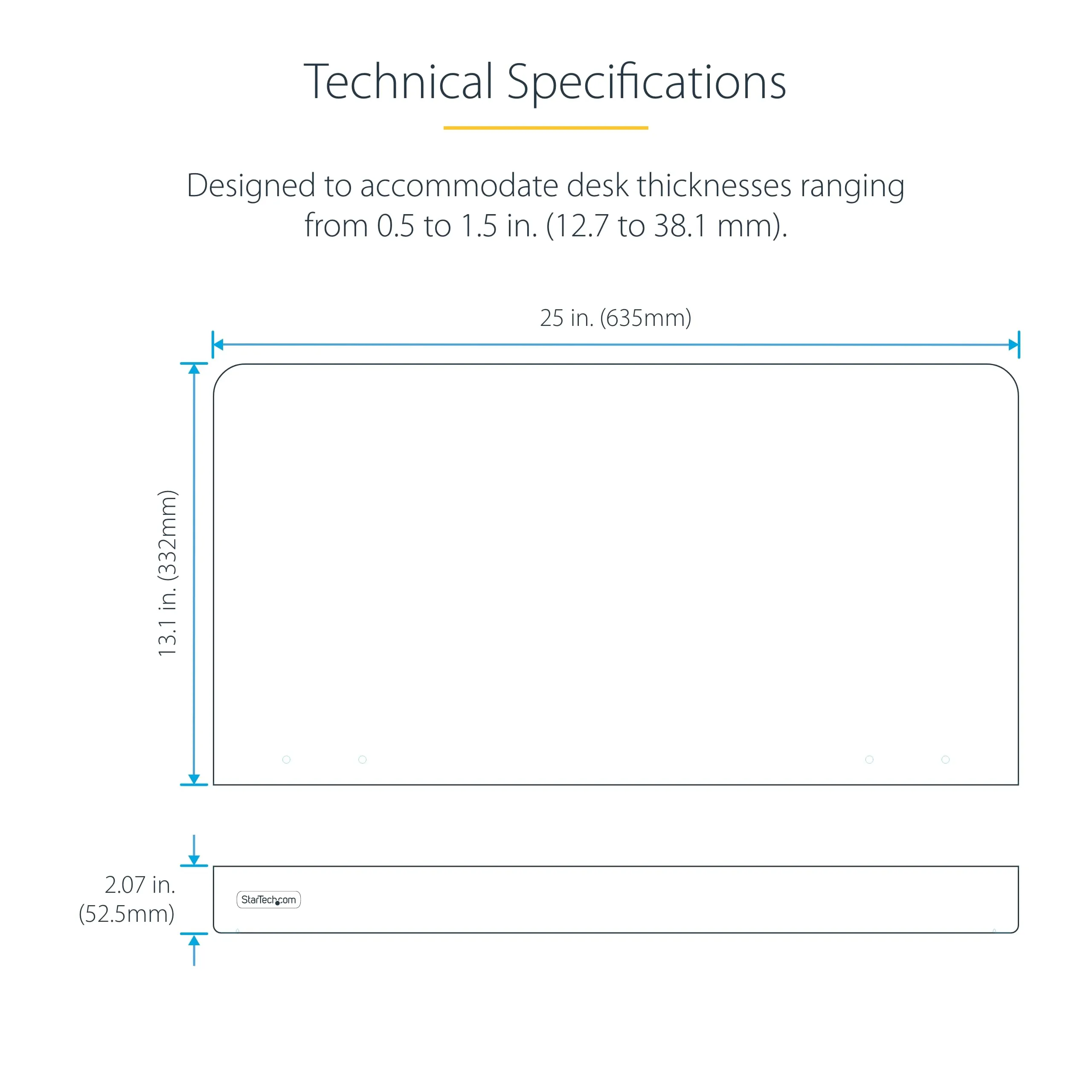 Maximize desk space with this steel corner sleeve for 90 L-Shaped/Corner desks - Increase workspace for a keyboard and mouse while resting the arms on the desk extender; Usable surface is 25x13.1in - Supported desk thickness 0.5-1.5 in - The knob-less clamp allows for enough clearance of knees/chair armrests; For wood or metal desks; Permanent or no-drill installation - The sturdy desk shelf ships fully assembled; Foam pads protect the surface - The desk tray is backed for 5-years