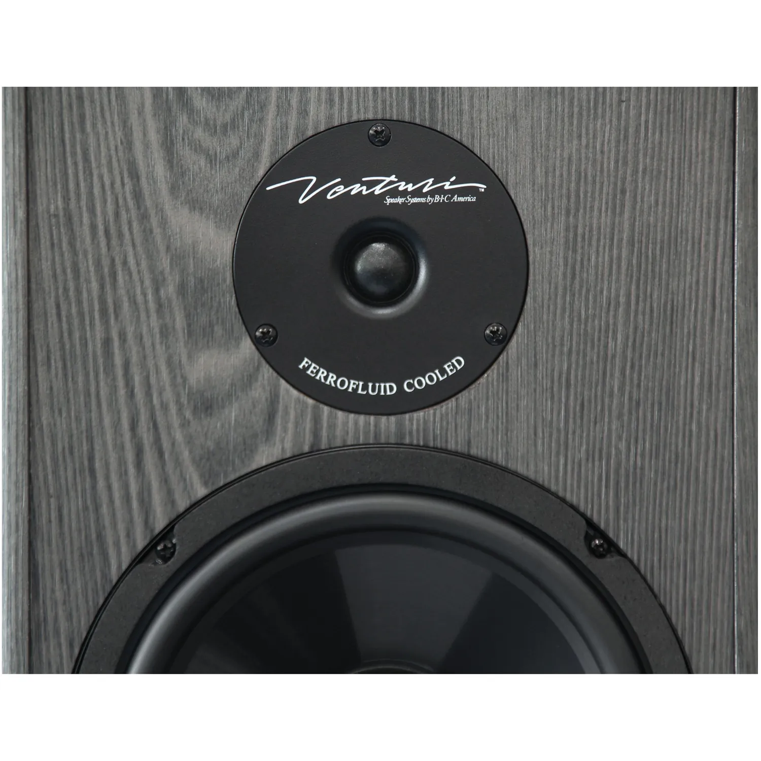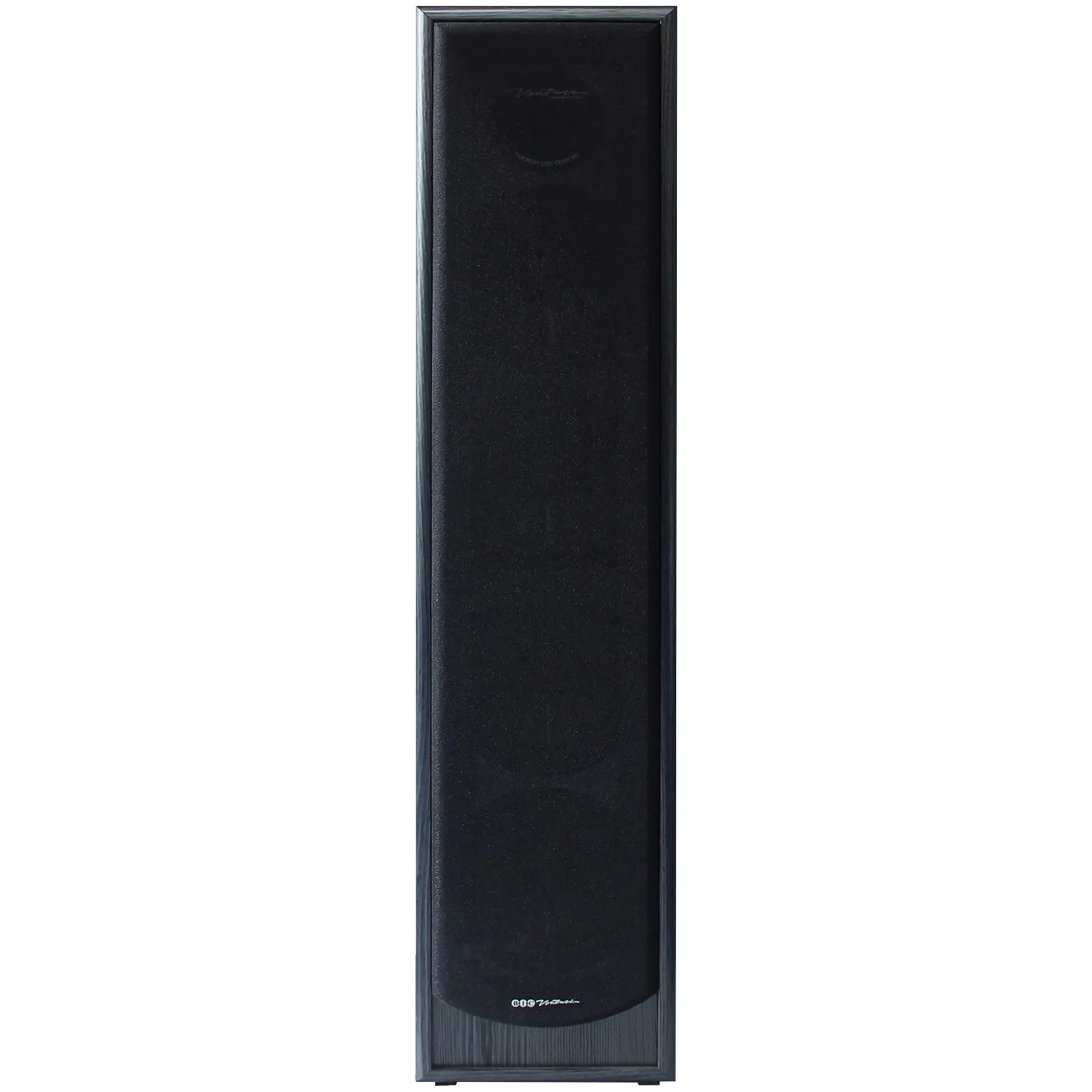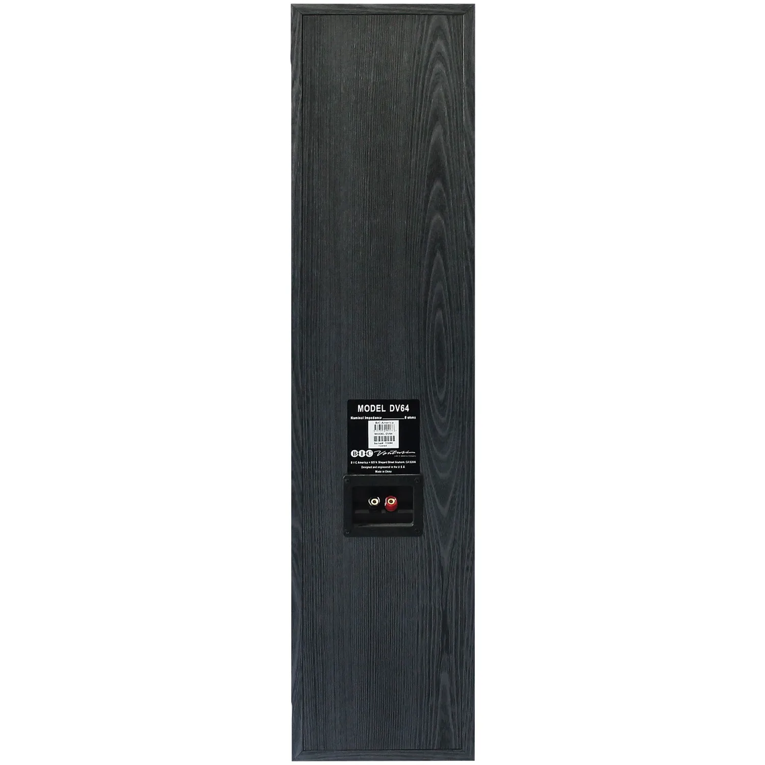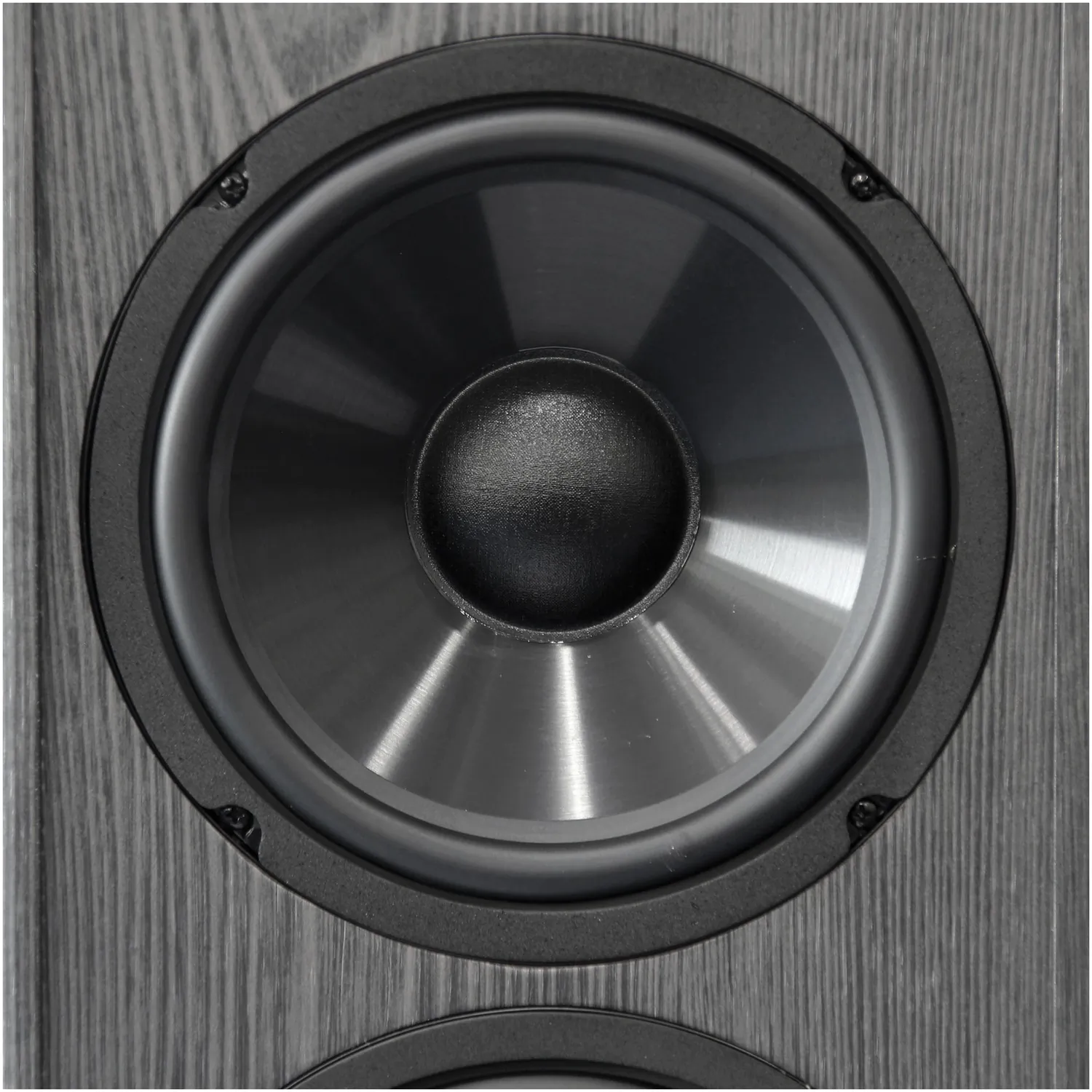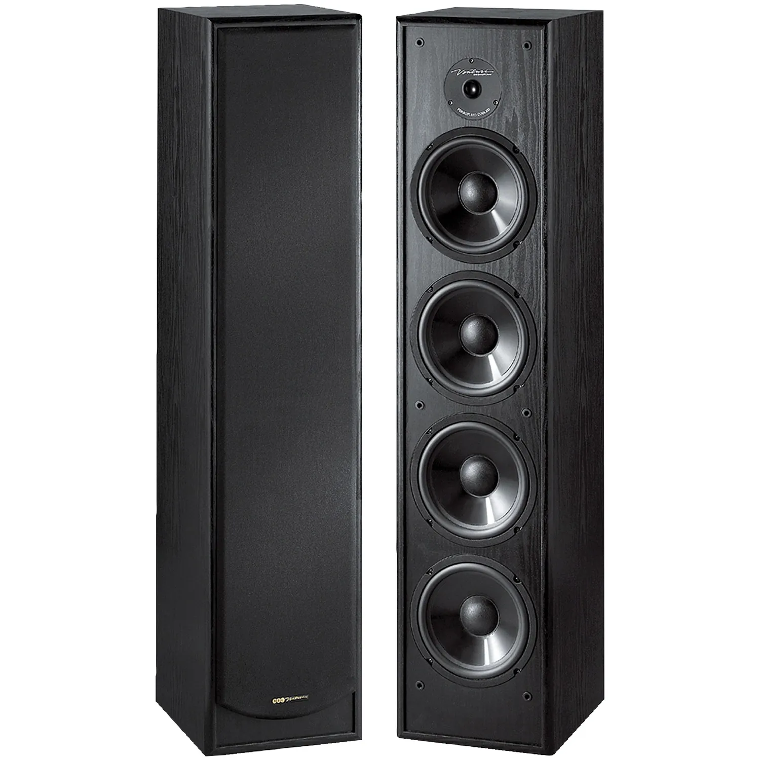 ? 10W-200W;? Two 6.5 active woofers with two 6.5 passive radiators ;? One .75 tweeter;? Freq resp: 29Hz-21kHz with 3kHz crossover;? Sensitivity: 90dB @ 1W/1m;? 5-way, video-shielded tower speaker system ;? Rich, black wood-grain cabinet;? Dim: 38H x 8.5W x 9.25D;? Each;? Black;