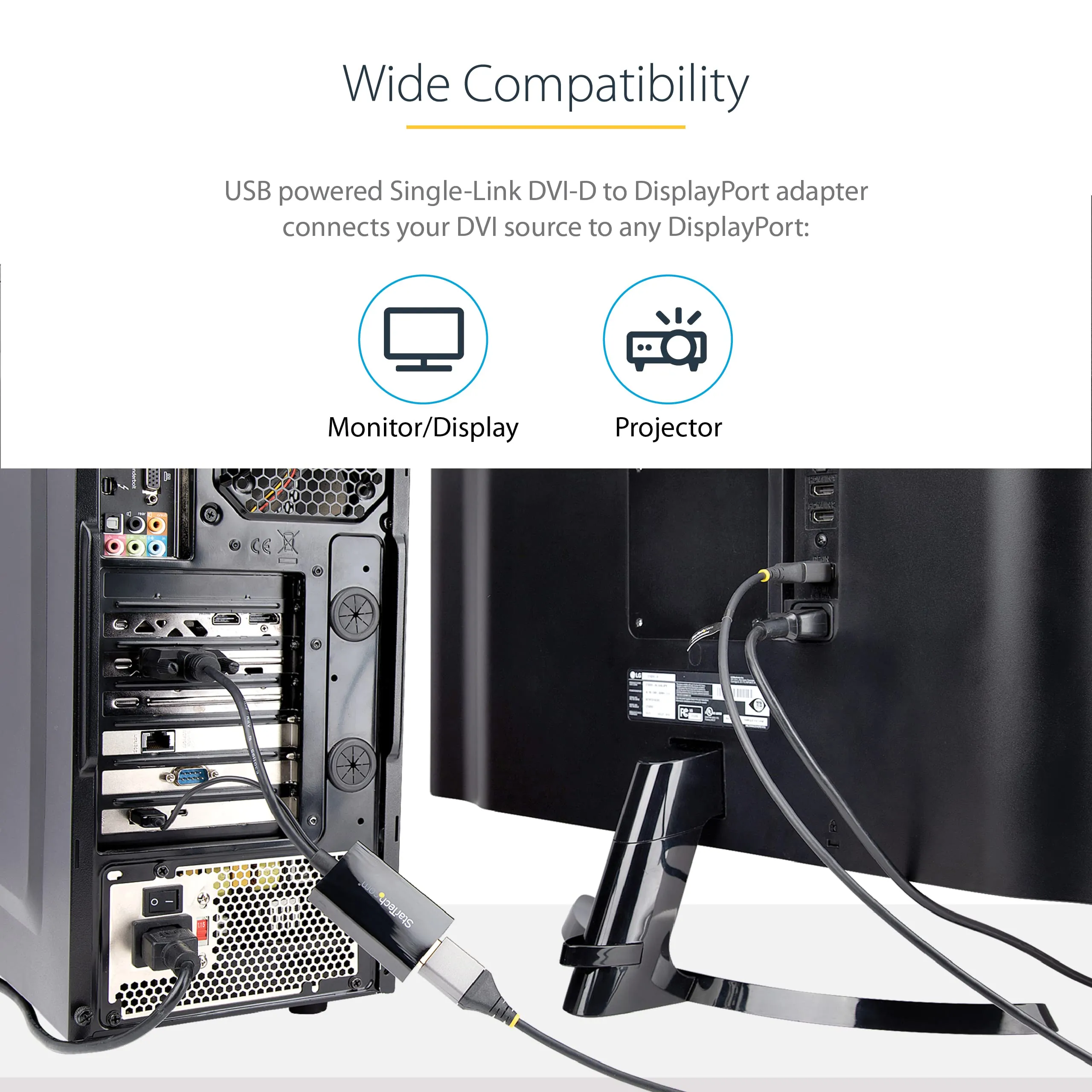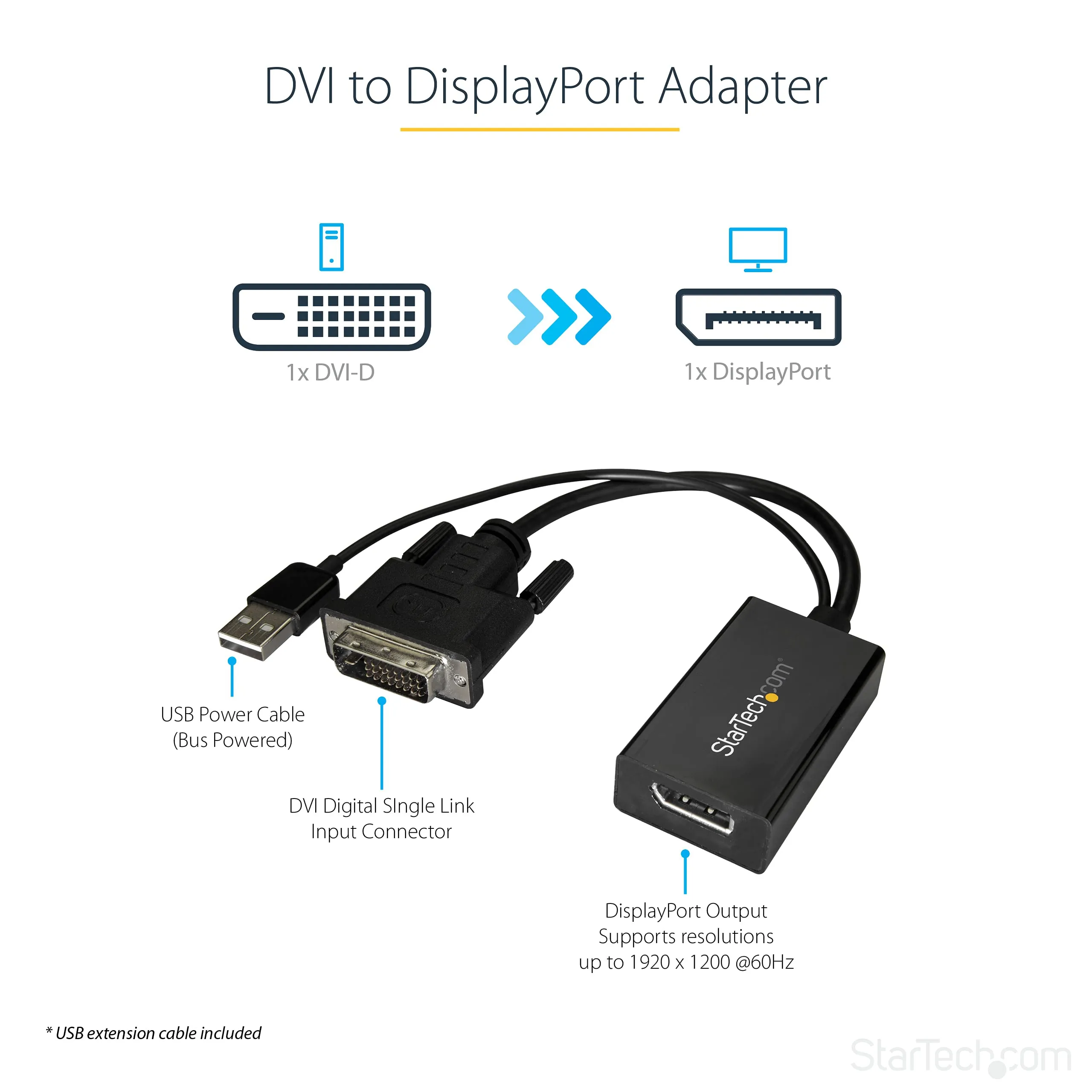 Convert your DVI output to DisplayPort with the StarTech DVI to DisplayPort Adapter. This reliable converter allows you to connect your DVI-equipped computer or device to a DisplayPort display, providing resolutions up to 1920 x 1200. The included USB power feature ensures stable performance, making it ideal for various applications.