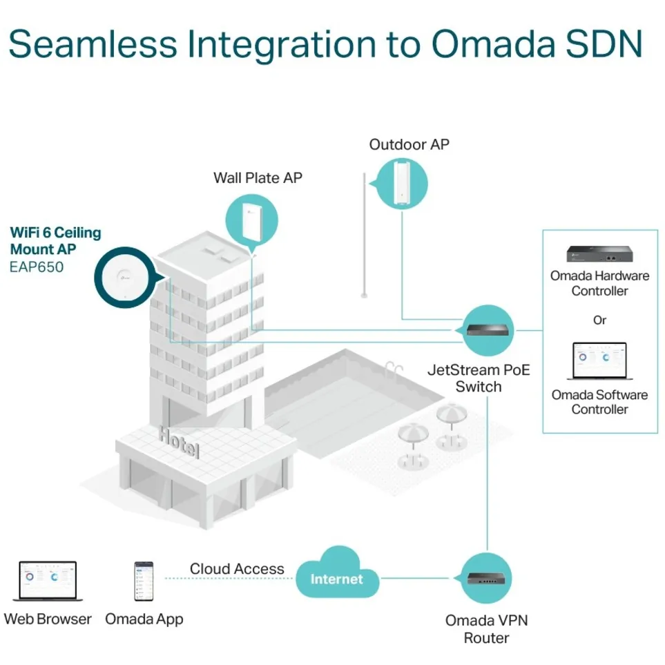 - Centralized Cloud Management: Omada SDN integration manages the whole network locally or from the cloud via web UI or Omada app.