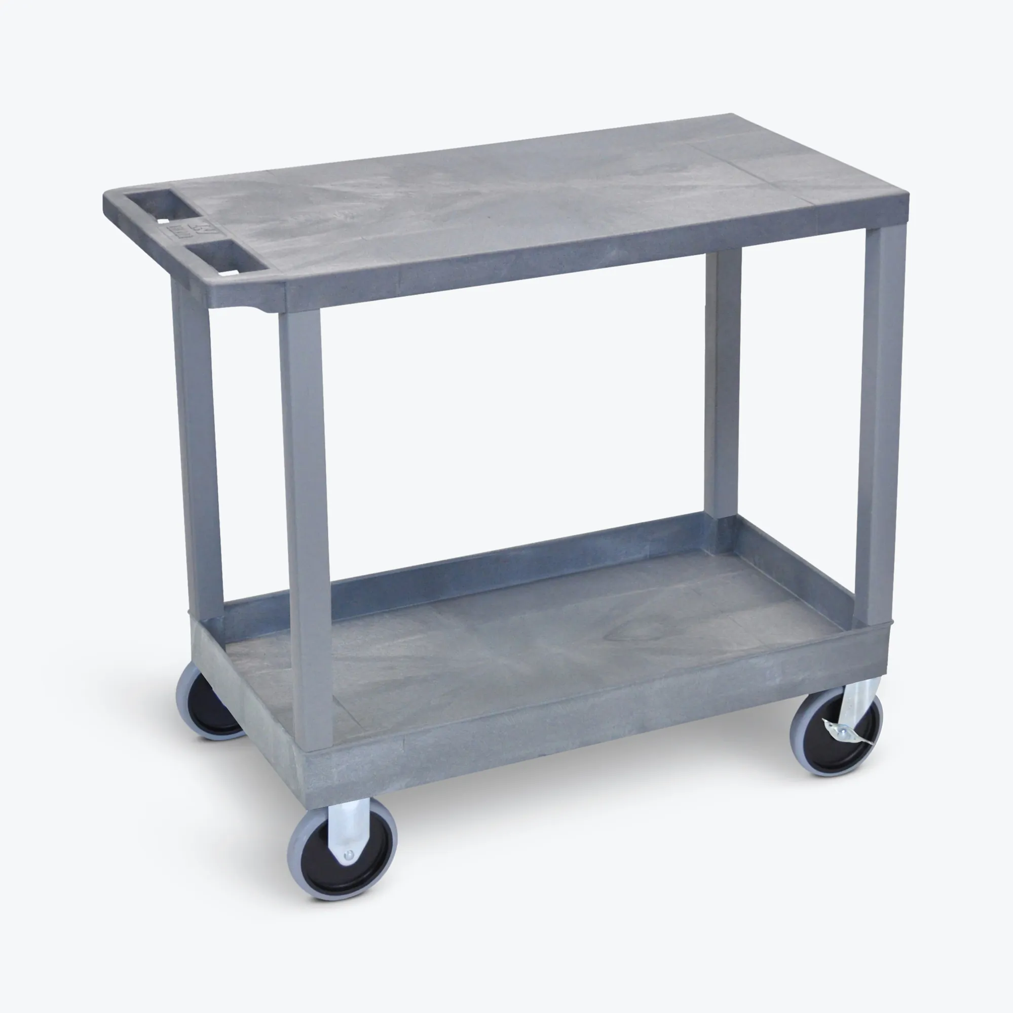 The Luxor EC21HD-G utility cart combines strength and versatility to facilitate your heavy-duty transporting needs. With a remarkable capacity of up to 500 lbs., this cart features a dual-shelf design that includes one 2.5" deep tub shelf on the top and one thick flat shelf on the bottom. Constructed from durable thermoplastic resin, the shelves resist scratches, dents, stains, and rust. Its 5" rolling casters, featuring two fixed casters and two full-swivel casters with locking brakes, ensure smooth maneuverability, making it ideal for transporting heavy loads with ease.