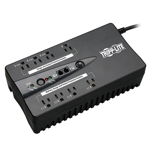 General InformationThe ECO650UPSM standby green UPS offers complete protection from blackouts, brownouts and transient surges. Supports green energy savings via built-in Eco outlets that automatically power off unused computer accessories like printers or multi-media speakers when the computer is not in use. Full load efficiency rating of 99% also offers energy-savings and cooler operation by limiting UPS power consumption to less than 4 watts! Eco-friendly design meets strict RoHS environmental standards. Provides uninterrupted transition to battery-derived AC output during brownouts and power failures with enough runtime to save and shutdown connected equipment without data loss. Offers complete protection in an ultra-compact desktop or wall-mountable housing. Includes 4 battery supported outlets for computer, monitor and two vital system peripheral, plus 4 additional surge suppression-only outlets for accessories not requiring battery support. Three of the surge-only outlets are designated Eco outlets that can be configured to automatically power-off when the computer enters standby mode or is shutdown. USB port enables UPS configuration options and unattended system shutdown without data loss in the case of extended power failure. PowerAlert software is available via free download from www.tripplite.com. USB cable included. Built-in single line RJ11 phone suppression protects modem, fax machine, cordless phone or other accessories with a dialup/DSL phone connection. Built-in audible alarm and front panel LEDs offer continuous status information regarding line and battery power operation. 650VA / 325 watt power handling ability supports a 60 watt PC with monitor for up to 30 minutes during power fail conditions. $100,000 connected equipment insurance (USA, Puerto Rico, & Canada Only).Technical InformationPlug/Connector Type: NEMA 5-15PReceptacles: 8 x NEMA 5-15RDataline Protection: RJ-11Protection Type: SurgeProtection Type: Black OutProtection Type: BrownoutProtection Type: TransientProtection Type: EMI / RFIBypass Switch: OptionalCord Length: 6 ftPower DescriptionLoad Capacity: 650 VA/325 WInput Voltage: 120 V ACOutput Voltage: 115 V ACOutput Voltage: 120 V ACInput Current: 10 AWaveform Type: Pulse-width Modulated Sine WaveSurge Energy Rating: 420 JManagementAlarm: OverloadAlarm: Power FailureControls/IndicatorsStatus Indicators: Power StatusOverload/check batteryECO-mode statusInterfaces/PortsModem (RJ-11): YesUSB: YesBattery InformationBackup/Run Time (Half Load): 11 MinuteEnvironmental ConditionsMaximum Operating Temperature: 104F (40C)Physical CharacteristicsHeight: 3.1"Width: 10.8"Depth: 5.7"Form Factor: DesktopForm Factor: Wall MountableWeight (Approximate): 6.60 lbMiscellaneousPackage Contents: Eco 650VA Energy-saving Standby 120V UPS with USB Port and Muted AlarmUSB CableInstruction ManualCertifications & Standards: UL1778 (USA)CSA (Canada)NOM (Mexico)Meets FCC Part 15 Category B (EMI)Environmentally Friendly: YesEnvironmental Certification: ENERGY STAR 2.0Environmental Certification: RoHSWarrantyLimited Warranty: 3 Year