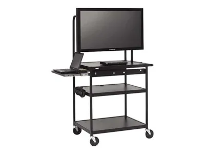 The Bretford Basics Flat Panel Multimedia Cart is designed to support monitors and notebooks with screen sizes ranging from 26" to 42". This versatile cart is constructed from durable steel with a sleek black powder coat finish, ensuring both stability and a professional appearance. Ideal for presentations, classroom settings, and multimedia applications, this cart offers easy mobility and convenient access to your devices.