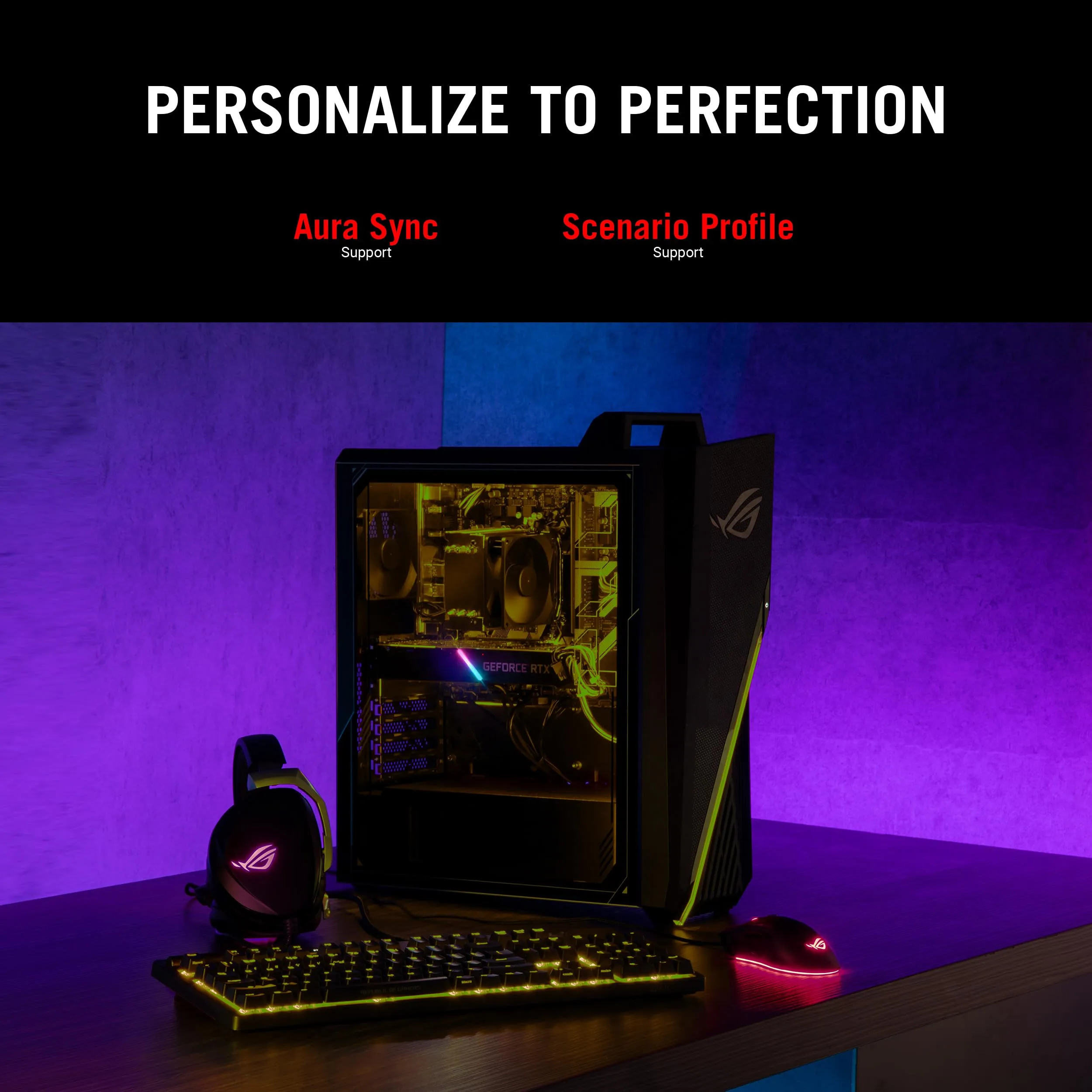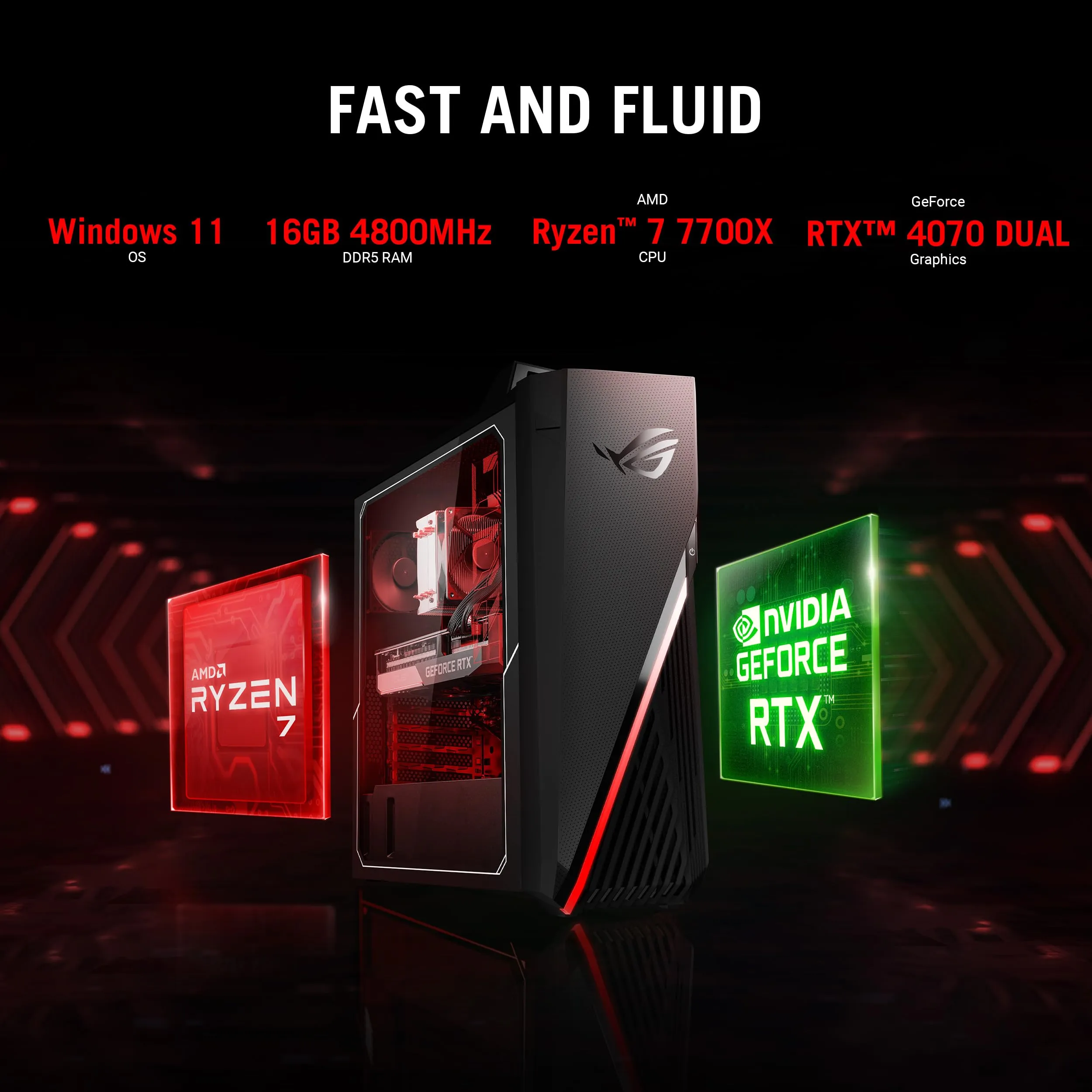 Experience high-performance gaming with the ASUS ROG Strix G15 Desktop. Powered by the AMD Ryzen 7 7700X Processor, it offers 8 cores and 16 threads with a maximum boost clock of up to 5.6 GHz. Designed for gaming, it features the NVIDIA GeForce RTX 4070 with 12GB of GDDR6X VRAM for stunning graphics.