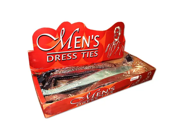 Each tie measures 55" in length from point to point and features an inside loop for secure fastening. With a variety of colors and patterns, these ties come with a convenient plastic hanger for store display and are individually packaged in a box containing 144 assorted ties.