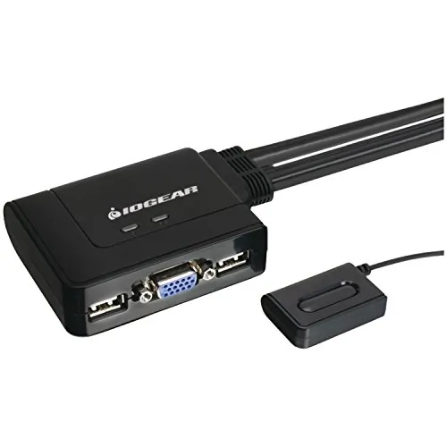 The IOGEAR 2-Port USB Cable KVM allows users to share a VGA monitor, a USB mouse, and a USB keyboard between two computers. Users can switch between computers using the wired remote switch button that can be placed on your desk for convenience. It offers an out-of-box solution with no additional cables needed. It supports multiple operating systems including Windows, Sun, and Mac. It is entirely plug-n-play and requires no software to run. It is also powered through the USB bus and thus does not require a power supply to run. It is the ideal KVM for those who want a competitively priced, entry level KVM that will allow them to multitask with two computers at their disposal.
