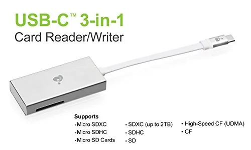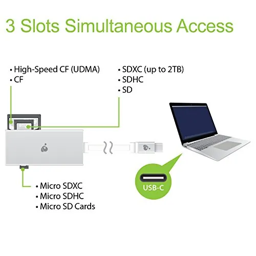 Enhance the capabilities of your USB-C laptop with the 3-in-1 USB-C Multi-Slot Card Reader and Writer. This device allows you to access multiple memory cards simultaneously, making it a perfect companion for photographers and videographers. Designed to plug directly into any USB-C port, it is compatible with devices such as the 12-inch MacBook, the latest Thunderbolt 3 MacBook Pro, and Windows laptops equipped with USB-C ports.