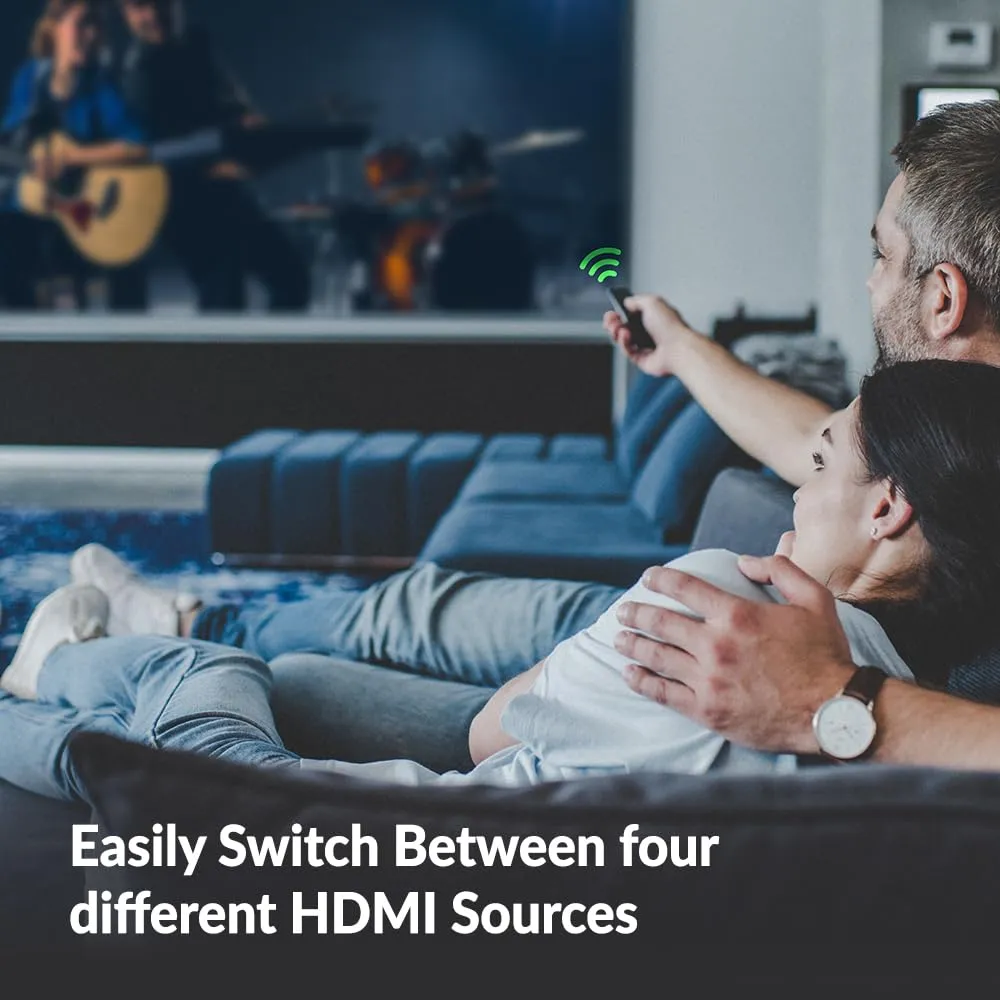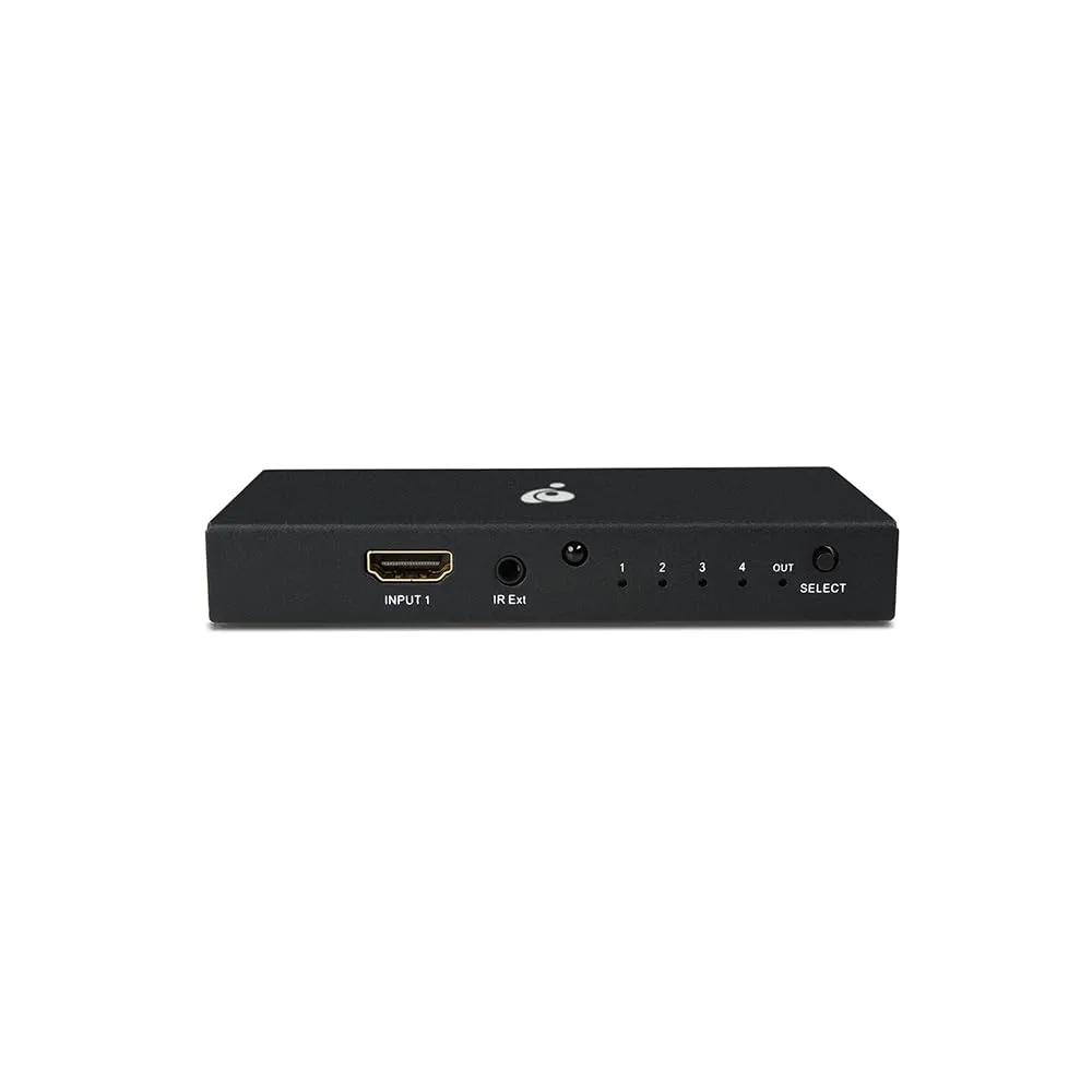 Conveniently switch between four devices using the included IR remote control.