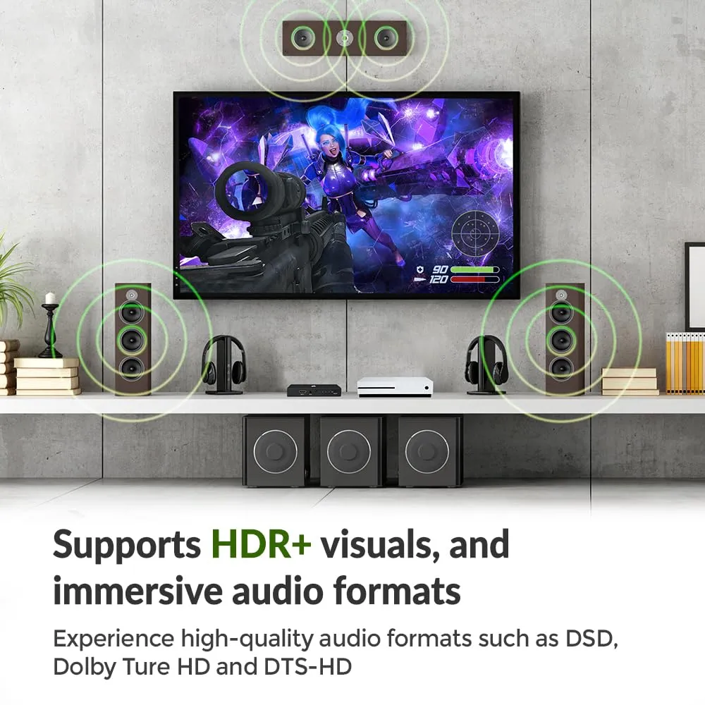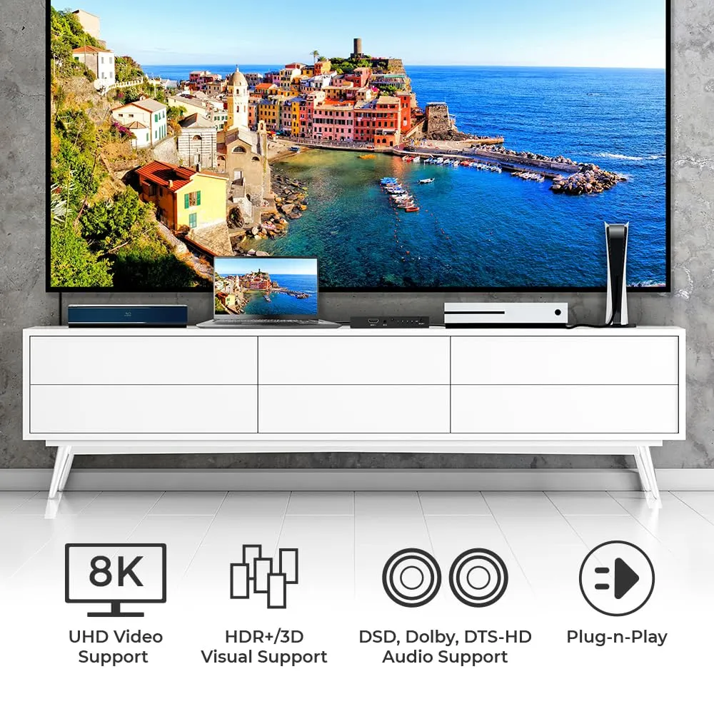The IOGEAR 8K HDMI 4-Port Switch allows you to connect multiple HDMI sources to a single display. Compatible with HDMI 2.1 and HDCP 2.3, this switch supports high-quality video resolutions up to 8K at 60Hz and 4K at 120Hz. Enjoy stunning visuals with HDR10, coupled with TrueHD and DTS-HD 7.1 digital surround sound for an immersive audio experience.