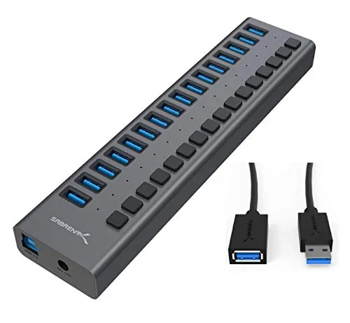 Introducing the 16-Port USB 3.0 Data Hub, designed for maximum efficiency and convenience. This versatile hub includes individual switches for each port, allowing you to manage power and connectivity seamlessly. With a total output of 90 Watts, it provides ample power for all your devices.