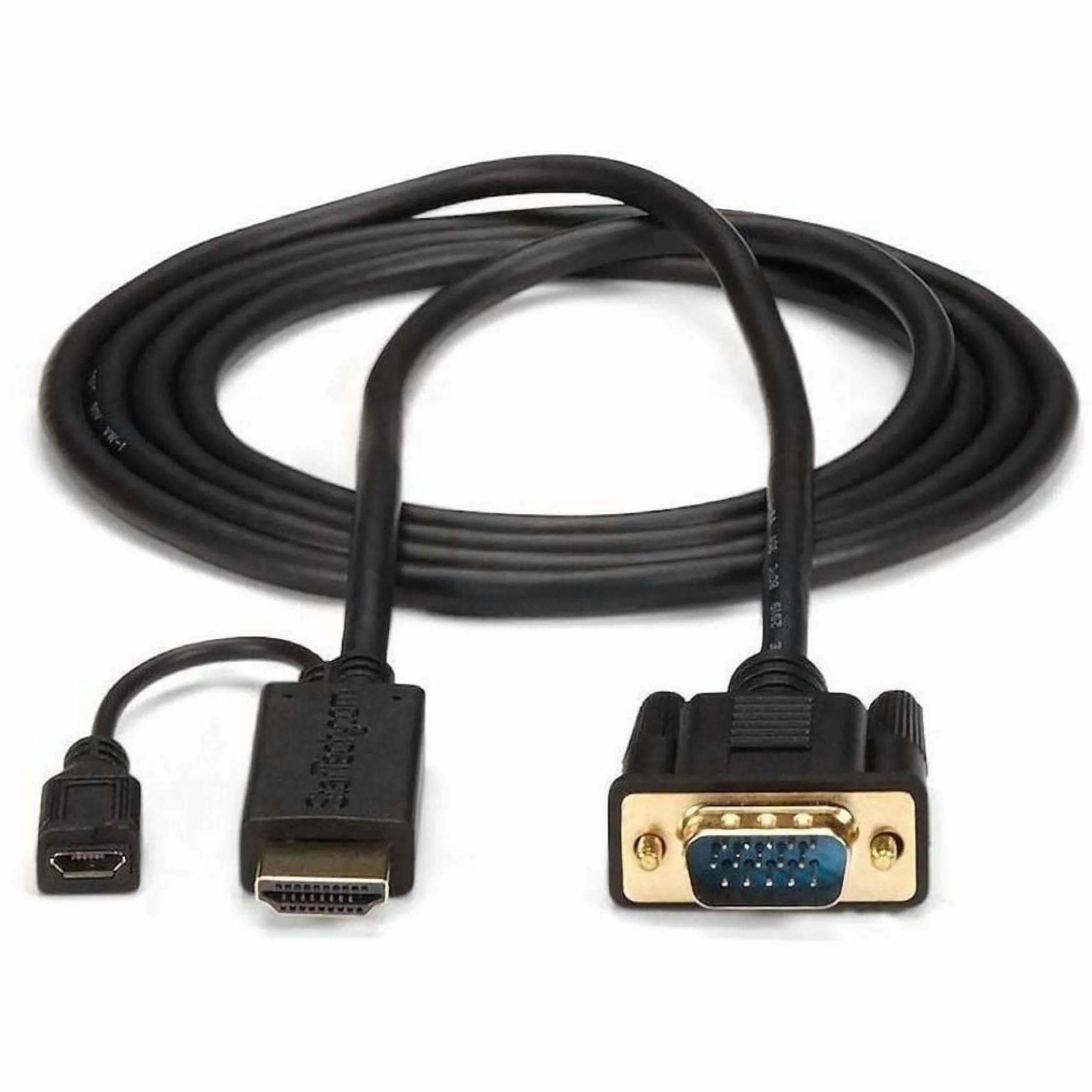StarTech.com 6 ft HDMI to VGA Active Converter Cable - HDMI to VGA Adapter - 1920x1200 or 1080p - HDMI/VGA for Video Device, Monitor, Projector - 6 ft - 1 x HDMI Male Digital Audio/Video, 1 x Type B Female Micro USB - 1 x HD-15 Male VGA - Black.Eliminate adapters, by connecting your HDMI source directly to a VGA monitor/projector using this 6ft adapter cable. The HD2VGAMM6 6ft HDMI® to VGA converter cable lets you connect your HDMI equipped Chromebook™, laptop or desktop to a VGA monitor or projector, with no additional adapters or cables required. The converter cable saves you the hassle of combining an HDMI to VGA adapter with a bulky VGA cable by providing an end-to-end solution for connecting your digital HDMI computer to your VGA monitor or projector. Unlike most HDMI to VGA adapters which require a power outlet to convert the video signal, the HD2VGAMM6 doesn't need external power in most installations. To work with Mac computers where extra power is needed, the HD2VGAMM6 features an optional integrated USB power source (USB cable not included), which makes connecting a display to your desktop or workstation that much easier, if additional power is required. In the past, converting digital HDMI toModel Number: HD2VGAMM6Product Name: StarTech.com HD2VGAMM6 Video CableProduct Type: Video CableCable Type: HDMI/VGACable Length: 6 ftConnector on First End: 1 x 19-pin HDMI Male Digital Audio/VideoConnector on First End: 1 x 5-pin Type B Female Micro USBConnector on Second End: 1 x 15-pin HD-15 Male VGAFeatures: ActiveConductor: CopperDevice Supported: Video DeviceDevice Supported: MonitorDevice Supported: ProjectorColor: BlackCertifications & Standards: CEFCCEnvironmentally Friendly: YesEnvironmental Certification: RoHS