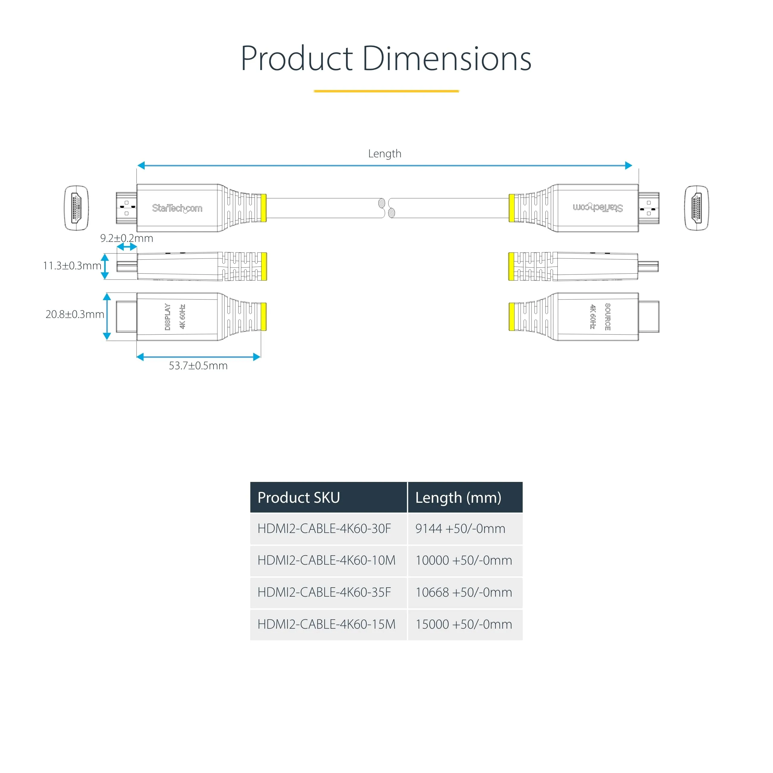 Connect this Active High Speed HDMI Cable to UHD-enabled HDMI devices; Use connector markings to quickly identify specs at-a-glance - Supports 4K 60Hz video with High Dynamic Range (HDR10); Guaranteed HDMI compatibility - Ideal for 4K TVs/monitors/docking stations; TPE jacket w/braided shield - Black; 35-foot (10.6-meter); HDMI 2.0 w/HDR10/HDCP 2.2/ARC; 18Gbps; 4K 60Hz/1440p 144Hz/1080p 120Hz; 32-ch Audio; Compatible w/HDMI 1.4; 24AWG; 9mm (0.35in) O.D.