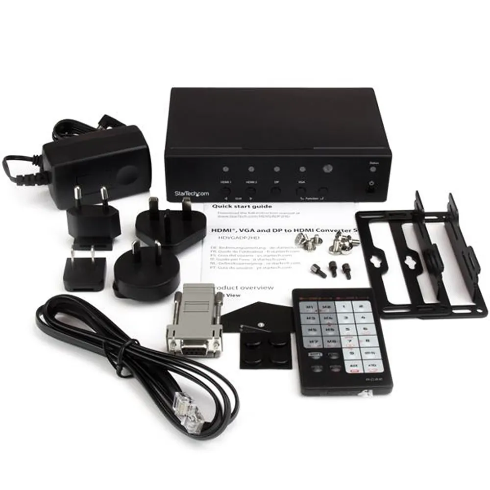This multi-input converter switch lets you connect your DisplayPort (DP), HDMI® and VGA audio/video sources to one HDMI display or projector. The switch enables you to automatically or manually switch between your video sources and features built-in signal conversion, which eliminates the cost and hassle of using additional adapters for the sake of compatibility.
