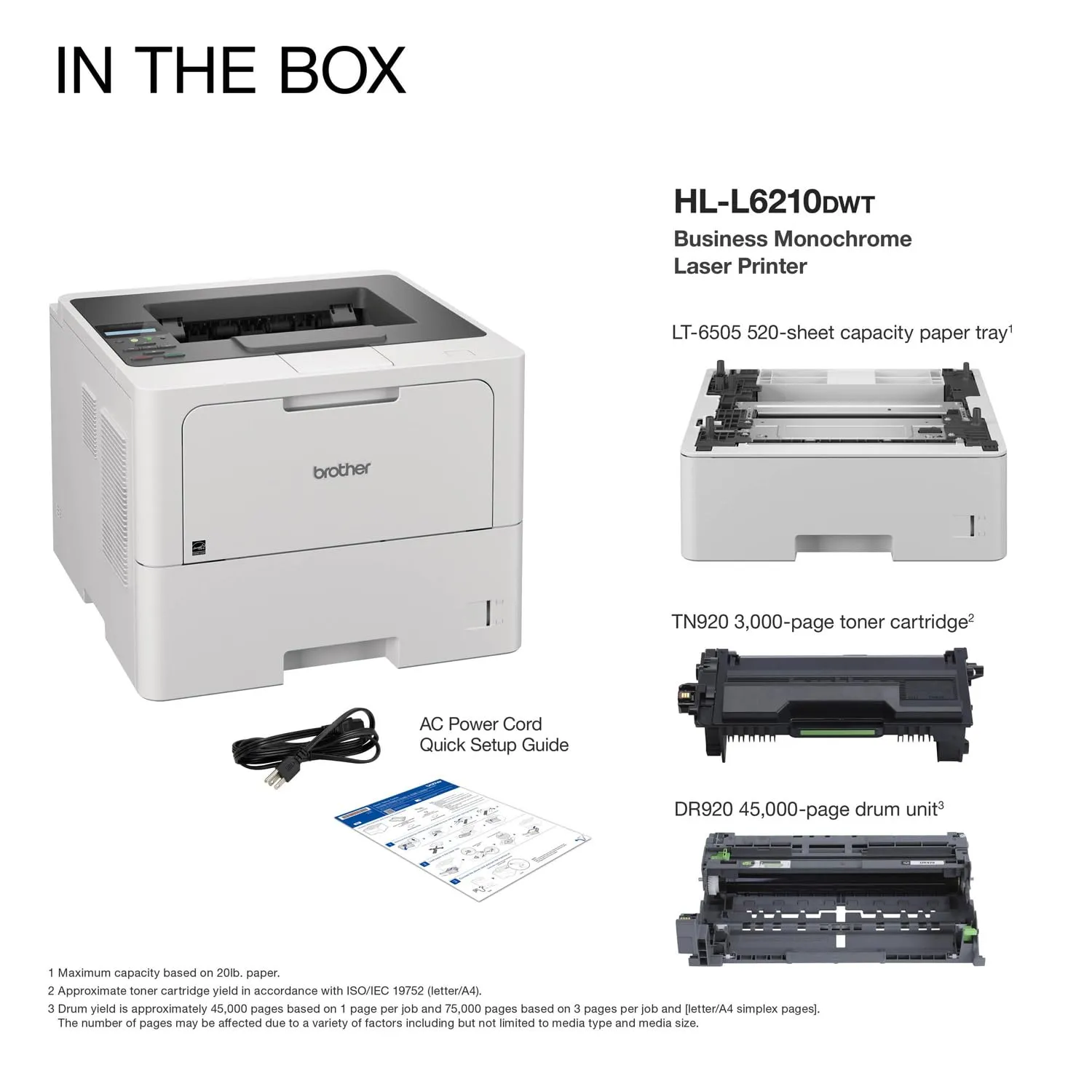 The Brother HLL6210DWT is a high-speed monochrome laser printer designed for small to medium-sized businesses. It features dual paper trays for greater capacity and flexibility, allowing for seamless printing of different paper sizes. With wireless networking capabilities, you can easily connect the printer to multiple devices. The duplex printing feature helps save paper while reducing your workload.