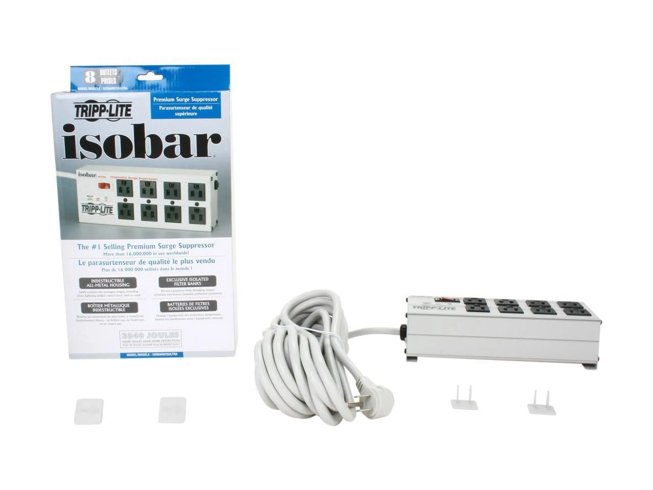 Loaded with a generous combination of high-quality components, near indestructible all-metal case and unique noise filtration system, this surge suppressor offers a high level of protection in a multi-outlet strip. Robust surge suppression circuits with sine-wave tracking offer extreme levels of protection against the heaviest surge conditions. Unique protection system combines large toroidal chokes, ferrite rod-core inductors, HF/VHF capacitors and multiple layers of metal oxide varistors into exclusive, isolated filter banks that remove EMI/RFI interference. Surge suppression rated at 3840 joules/97,000 amps offers network-grade protection. Widely spaced NEMA 5-15 outlets accommodate up to four large transformer plugs without blocking outlets. Diagnostic LEDs confirm power availability, line fault and protection status. Surge suppressor includes 25' AC line cord with space-saving angled input plug, keyhole mounting tabs and a set of four child-safety covers.Tripp Lite Isobar 8-outlet Surge Suppressor