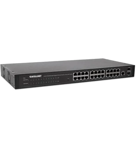 24 Port Web-Managed Gigabit Ethernet Switch with 2 SFP PortsThis 24 + 2 Layer 2 Gigabit Switch is a high-performance SNMP-managed device that provides users with 24 10/100/1000 Mbps Ethernet and 2 additional Gigabit SFP ports. The Web/SNMP management provides remote control capability providing flexible network management and monitoring options. Whether managed through an "in-band" SNMP management station or an Internet Web browser, the Intellinet 560917 Gigabit switch facilitates network management and problem diagnosis. All RJ45 ports with Auto-MDIX and NWay auto-negotiation support Complies with the IEEE 802.3az (Energy Efficient EEE) specification Web-or Telnet-based configuration SNMP V1, V2 with RMON groups 1, 2, 3, and 9 VLAN (Tag-based and port-based) 802.1x authentifcation and IP/MAC based Access Control Lists (ACL) Link Aggregation/ACP (Port Trunking) IGMP Snooping Bandwidth control per port Port Mirroring Broadcast storm control with multicast packet rate settings Supports jumbo frames up to 9kBytes Rapid Spanning Tree/Spanning Tree protocol Store and forward switching architecture Fanless design ideal for silent operation Full/half duplex operation IEEE 802.3x flow control for full duplex 8K MAC Address entries Packet Filter/Forwarding Rate: 1,488,000 pps (1000Mbps), 148,900 pps (100Mbps), 14,880 pps (10Mbps)Rackmount Packet Buffer Memory: 512kBytes Total Ports: 26 Gigabit Ethernet Ports: 24 SFP Ports: 2 QoS: port-based, 802.1p, DSCP IEEE Protocols: 802.1d, 802,1p, 802.1q, 802.1s, 802.3ad, 802.3, 802.3ab, 802.3az, 802.3u, 802.3x