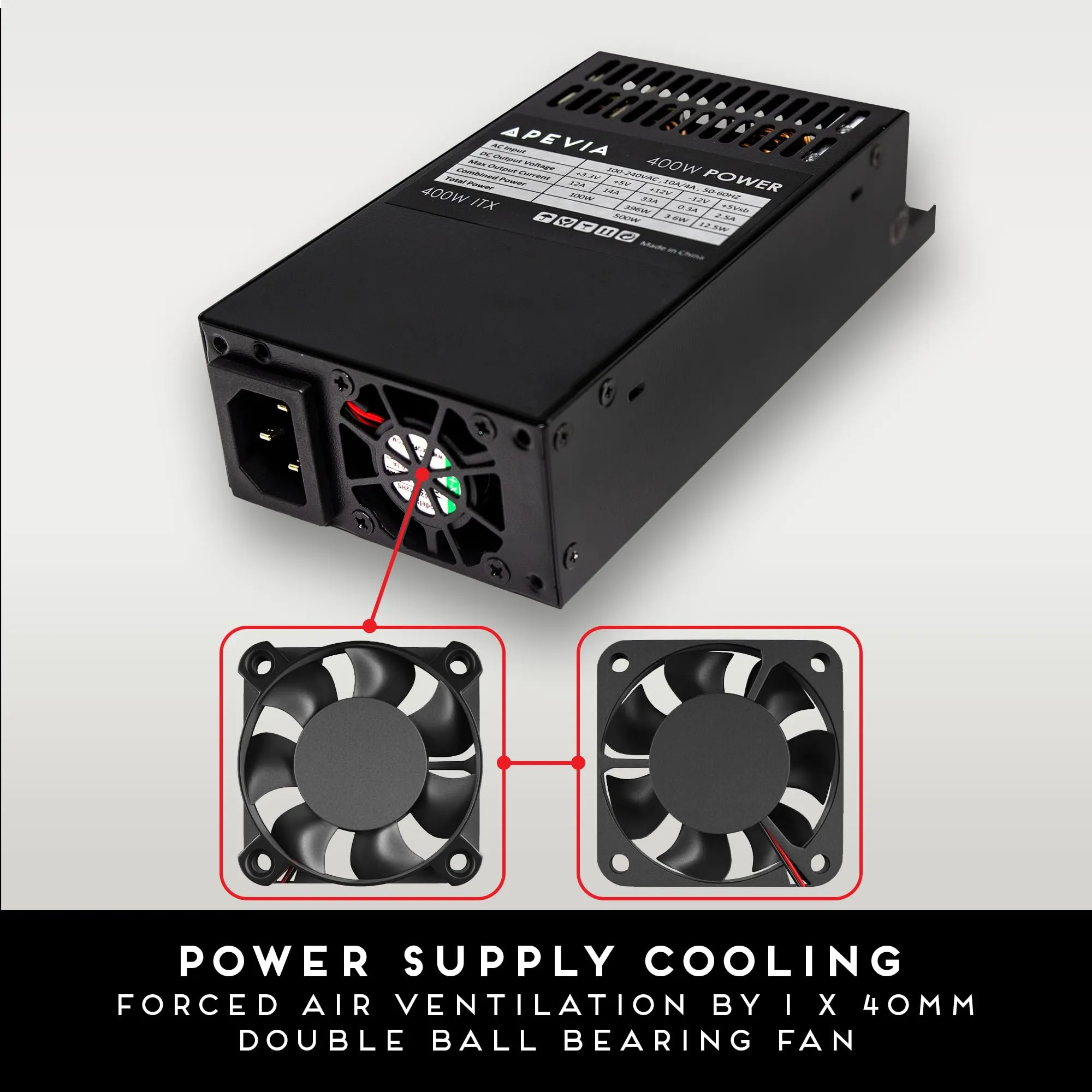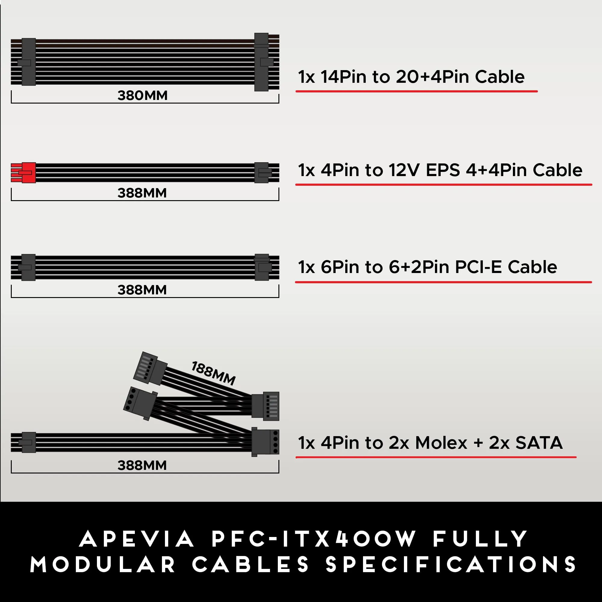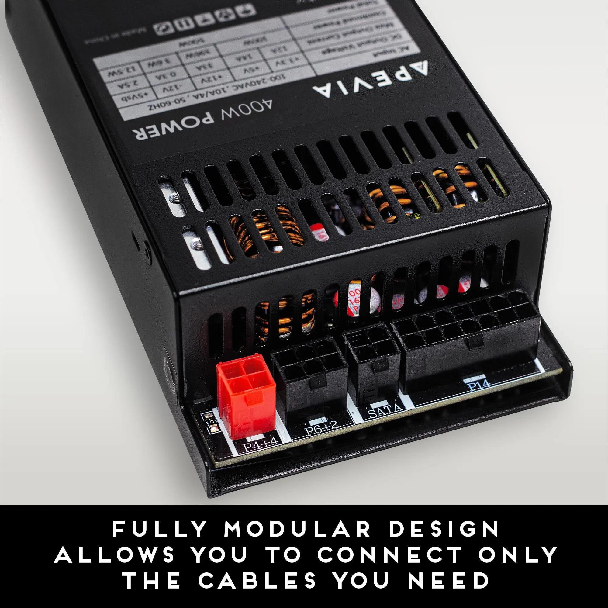 The Apevia 400W Fully Modular Mini ITX Power Supply is designed for compact systems, providing a reliable and efficient power source for your Flex ATX or Mini ITX builds. With a full range active PFC ranging from 90-264V, this PSU ensures compatibility across various power environments. Ideal for gaming servers and small form factor computers, this power supply delivers stable performance and modular cabling for easy installation and improved airflow.