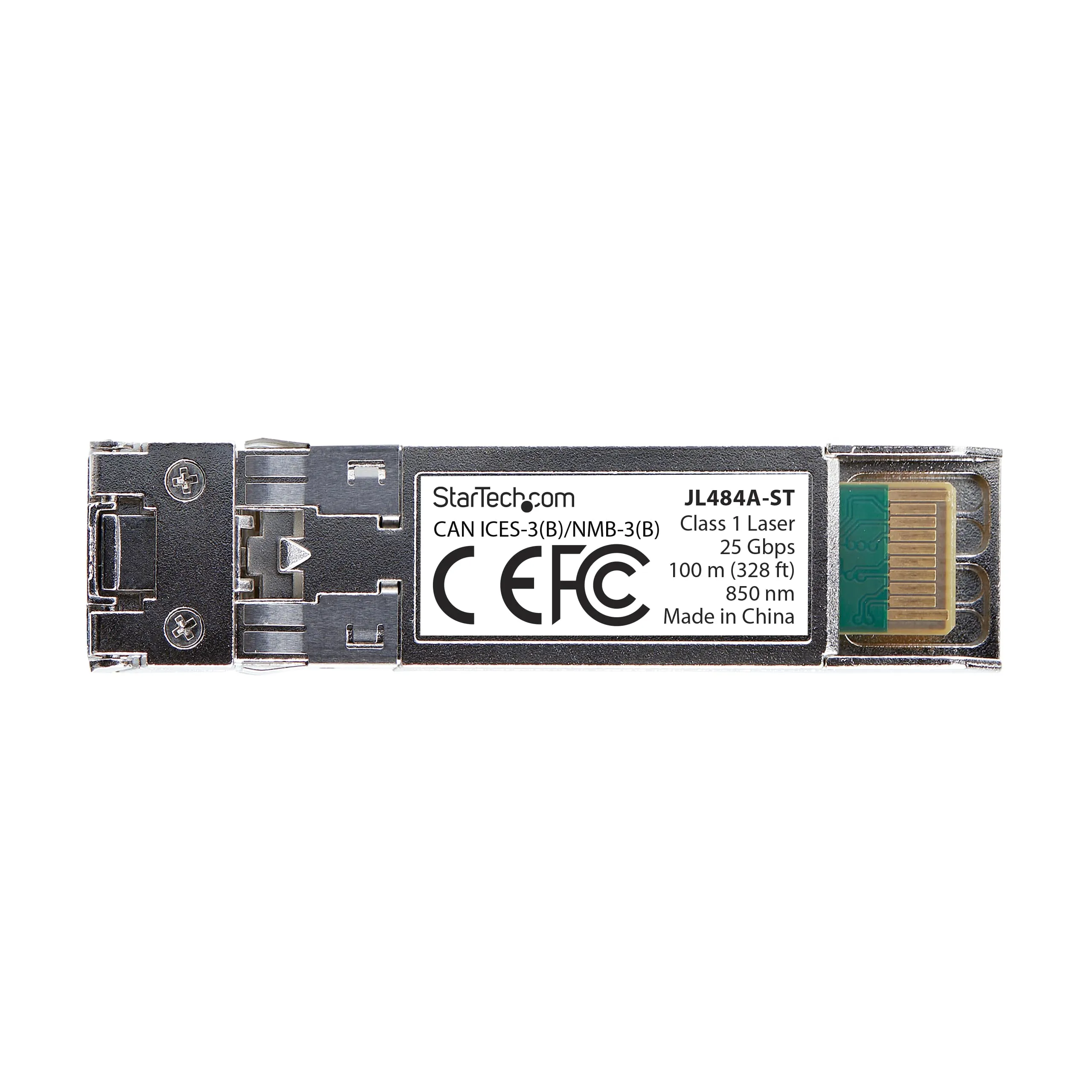 HPE-compatible SFP28 transceiver equivalent to JL484A MMF module; Tested for seamless integration with HPE switches for reliable 25Gbps connectivity up to 100m (328ft) - Maximize bandwidth for data migrations/high-capacity network storage/Multimedia upload - Technical Specs: 25GBase-SR LC SFP28/25GbE/Multimode Fiber (MMF)/LC Duplex connector/850nm/DDM/DOM - Works with MSA-compliant switches that accept uncoded fiber modules - This 25 Gigabit optical transceiver is backed for life.