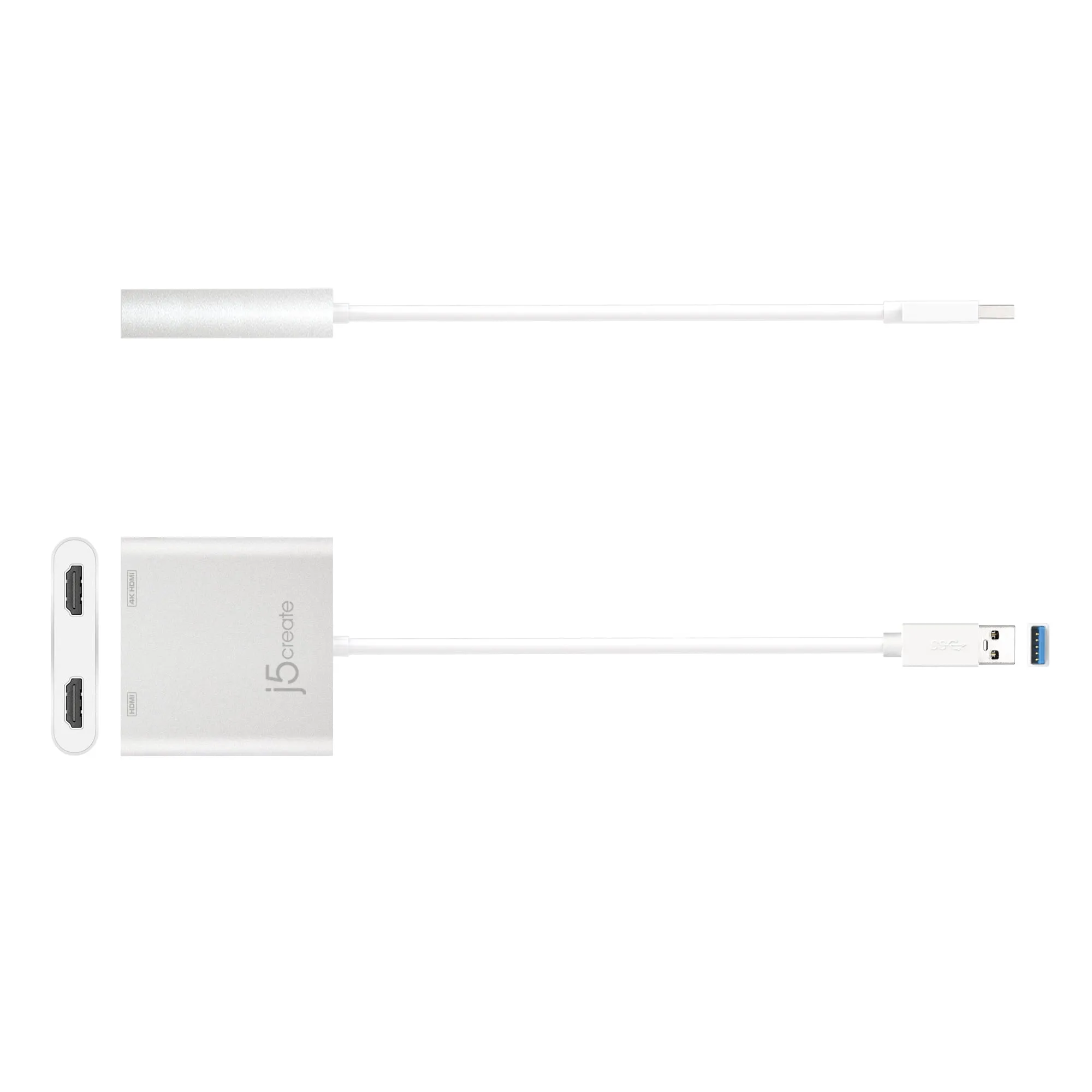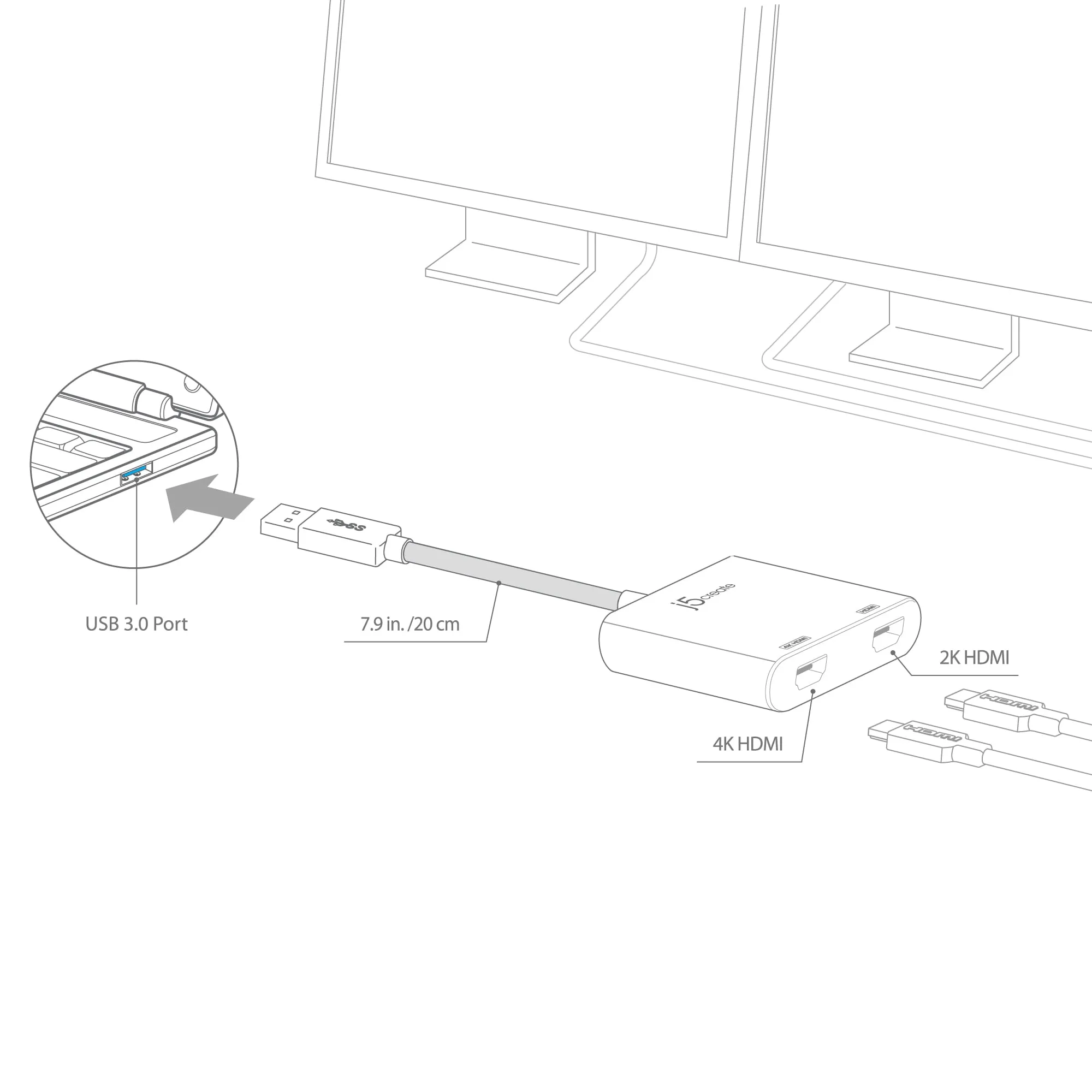 The j5create USB 3.0 to Dual HDMI Multi-Monitor Adapter allows you to connect two HDMI displays to your computer through a single USB port. This adapter is ideal for expanding your desktop workspace, streaming media, or presenting at meetings and conferences.