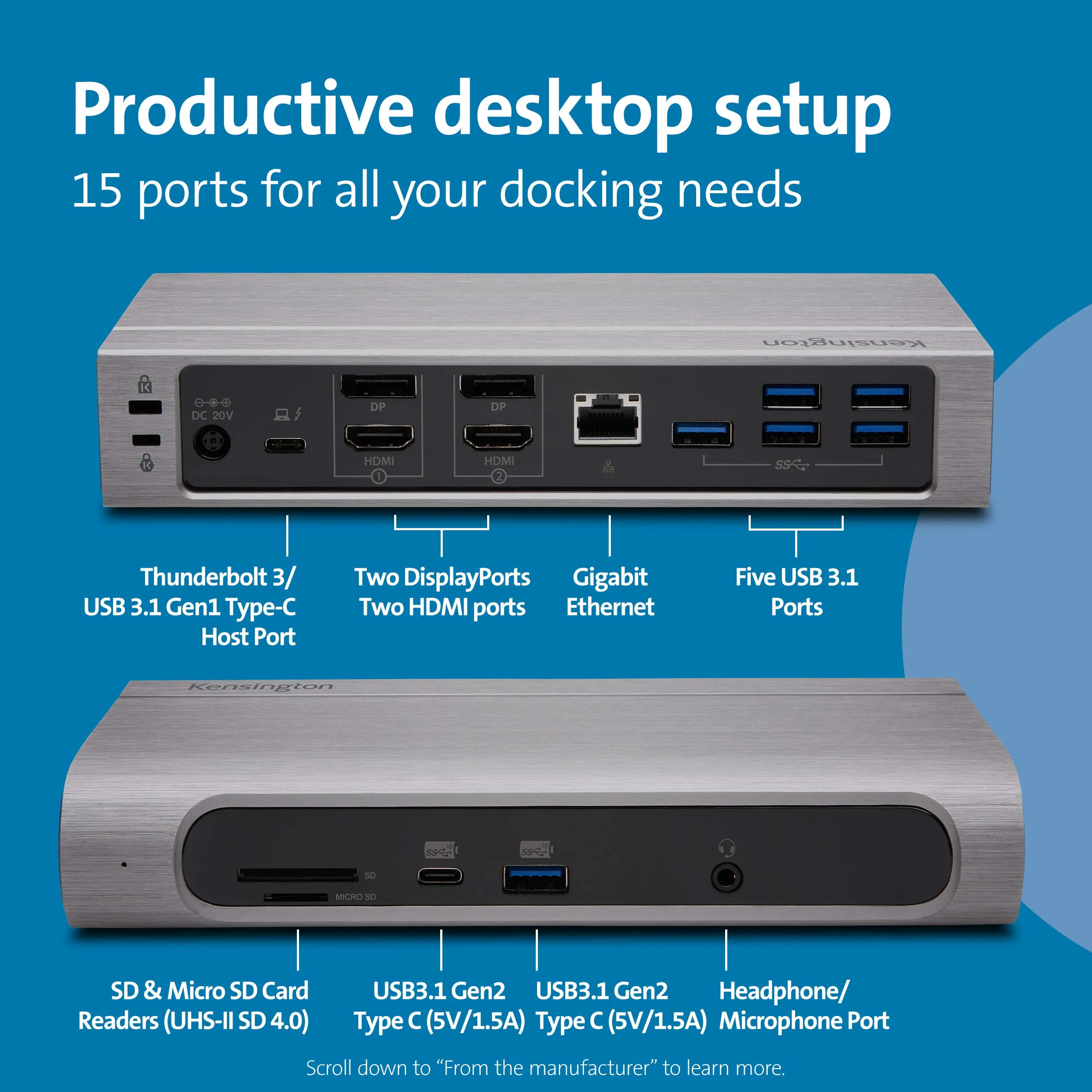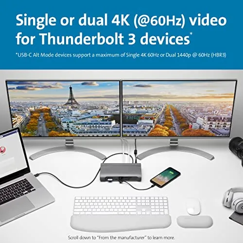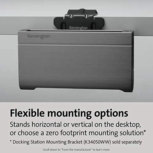 SD5600T Dock Thunderbolt 3 - Features include universal compatibility, ideal for hot-desking and mixeddeployment environments; the flexibility to select between HDMI 2.0and DP 1.2; 100W of power delivery (perfect for the newer MacBook Pro);horizontal or vertical placement options; seven USB ports (two withcharging), one Gigabit Ethernet port, and one audio combo jack; builtinSD and Micro SD card readers (UHS-II SD 4.0 for the fastest speedspossible); and a three-year warranty. For a zero-footprint mountingoption, see our Docking Station Mounting Bracket (K34050WW), soldseparately.