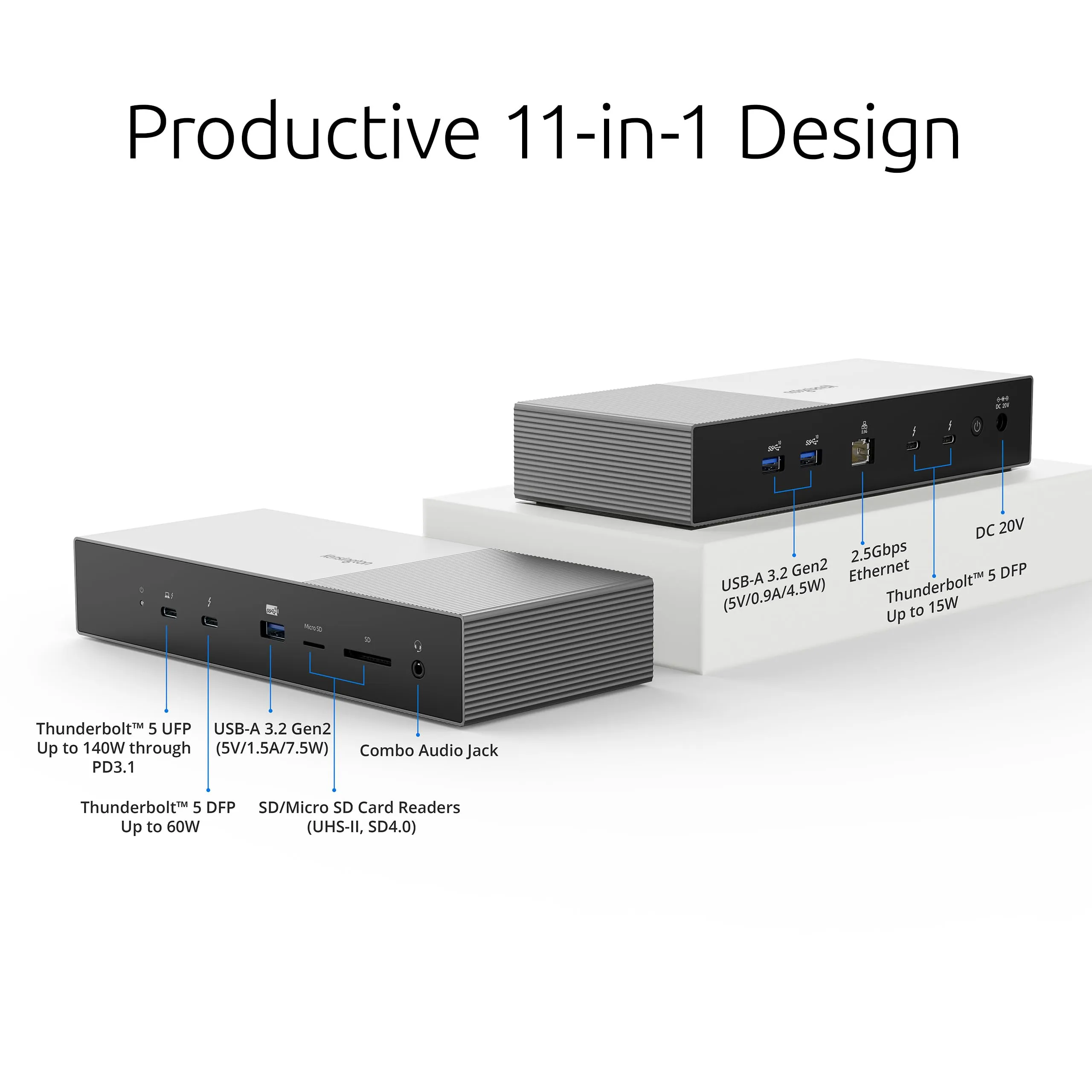 Enhance your productivity with the SD5000T5 EQ Thunderbolt 5 Triple 4K Docking Station. Experience lightning-fast 80Gbps data transfers, with the capability of Bandwidth Boost providing up to 120Gbps for video-intensive applications. Connect up to three 4K monitors at 144Hz or two 8K monitors at 60Hz, streamlining your setup with an impressive 140W Power Delivery through its three Thunderbolt 5 ports, three USB-A 3.2 Gen 2 ports, audio jack, dual SD/Micro Card readers, and 2.5Gbps Ethernet.
