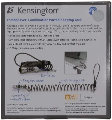 The ComboSaver Combination Portable Notebook Lock is security that travels easily with a cable that instantly coils. Plus the low-profile lock fits great with slim notebook designs. Works with 99% of all notebooks via the Kensington Security Slot. Online registration makes it easy to retrieve lost combinations
