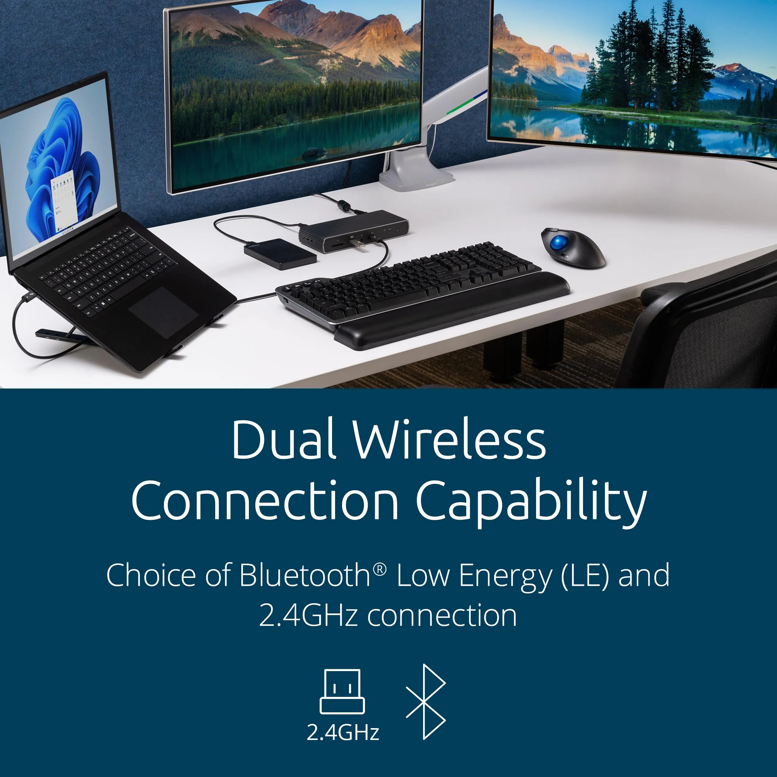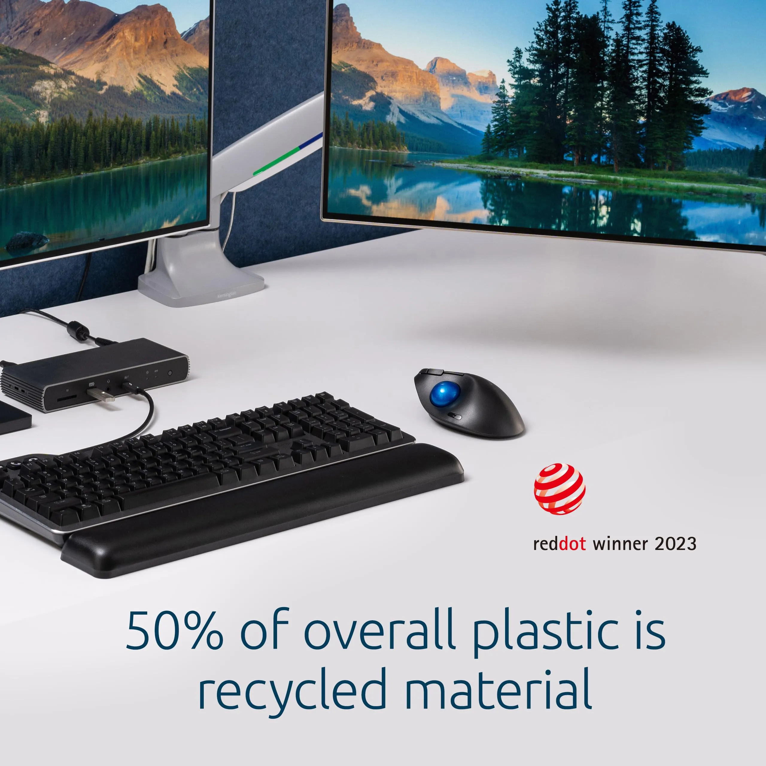 The Pro Fit Ergo TB450 Wireless Trackball Mouse offers users a comfortable hand experience and high precision in a compact design. This innovative trackball integrates a unique ergonomic design and is made from 50% recycled materials. With both Bluetooth Low Energy (LE) and 2.4GHz wireless connectivity, it provides the flexibility to connect across various devices.