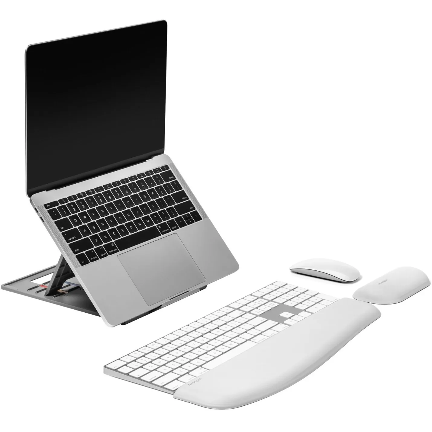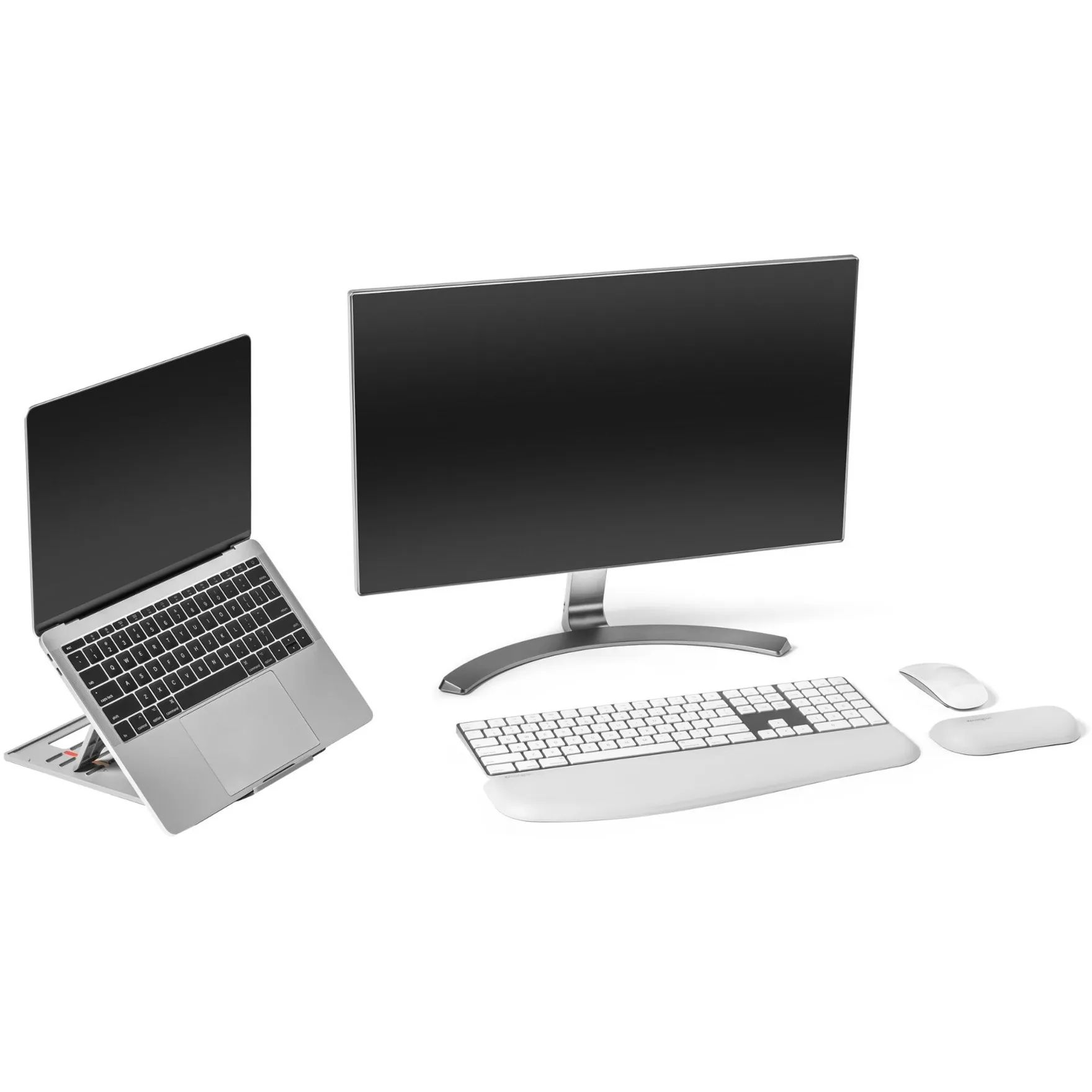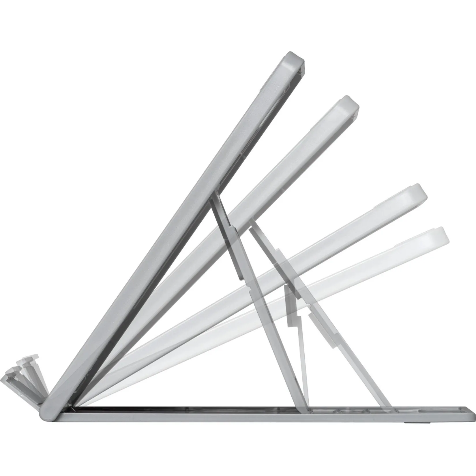 OVERVIEW: Combine the ergonomic benefits of raising your screen height with the technological benefits of increased air circulation for your laptop or tablet with the Kensington SmartFit Easy Riser Go Adjustable Ergonomic Laptop/Tablet Riser and Cooling Stand. The sleek 2-in-1 design is height and angle adjustable to improve posture, promote proper eye alignment and support neck and shoulder comfort while keeping the laptop or tablet's internal components cool. Anti-slip foot pads prevent the stand from sliding forward, padded inserts provide a secure fit for your device, and the slim foldable design is made for travel. Use with an external keyboard and mouse (sold separately). Supports laptops and tablets up to 14". FEATURES & BENEFITS: SmartFit System simplifies ideal ergonomic height positioning using scientifically proven research to support proper fit and individualized comfort. The SmartFit System is designed to work with proper laptop monitor height and is not applicable for use with tablets. Height Adjustable to allow users to lift the laptop or tablet as high as 215mm (8.5in) for optimal eye alignment. Foldable Dual Kickstand Structure provides additional viewing and height flexibility options within a space-saving desktop footprint. Stability-Focused Design uses textured padded inserts and a wide bottom ledge with front lip to ensure a secure fit, plus anti-slip silicone foot pads to keep your device in place while you work. Pro Air Circulation dissipates heat buildup to extend the longevity of your device s battery and internal components. Smart Portability provides a space-saving footprint that can fit a variety of desktop spaces, a flat and slim folding structure for traveling, a built-in handle for easy carrying and durable hard-edges for extra protection.