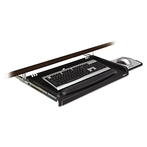 Features three height positions on a track with ball-bearing hardware ensures smooth operation. Extra-wide tray accommodates virtually all keyboards. Includes a leatherette gel wrist rest with anti-microbial protection and 3M Precise Mousing Surface. Retractable mousing tray attaches on either the left or right.