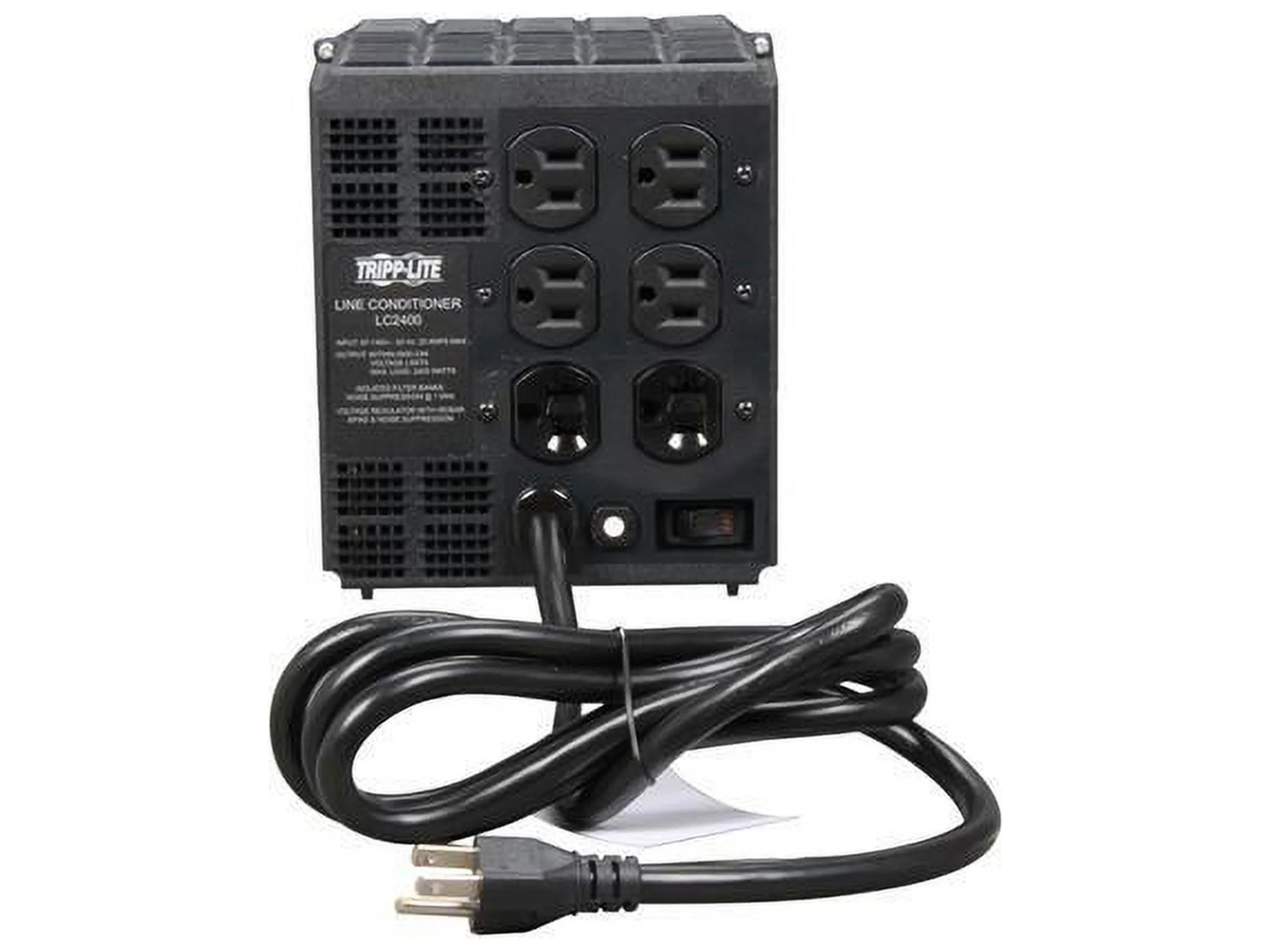 The Tripp Lite LC2400 2,400 Watt 120-Volt Line Conditioner adjusts under- and overvoltages to provide safe, computer-grade AC power. The automatic voltage regulation (AVR) offers 3 levels of voltage stabilization that corrects undervoltages as low as 89 volts and overvoltages as high as 147 volts back to regulated 120-volt nominal power. Providing optimum voltage conditions not only extends the life of your equipment, but also keeps your equipment working through brownouts and prolonged overvoltage conditions. The network-grade surge suppression prevents even the strongest spikes from inflicting damage, data loss or corruption and audio/video performance problems on your connected equipment. Noise filtering removes potentially disruptive line noise. Plug up to 6 devices into the 4 NEMA 5-15R outlets and 2 NEMA5-20R outlets. You can monitor AC power, incoming voltage level and AC line status using the 7 diagnostic LEDs on the front panel. The compact LC2400 will fit comfortably into your computer or home theater setup!