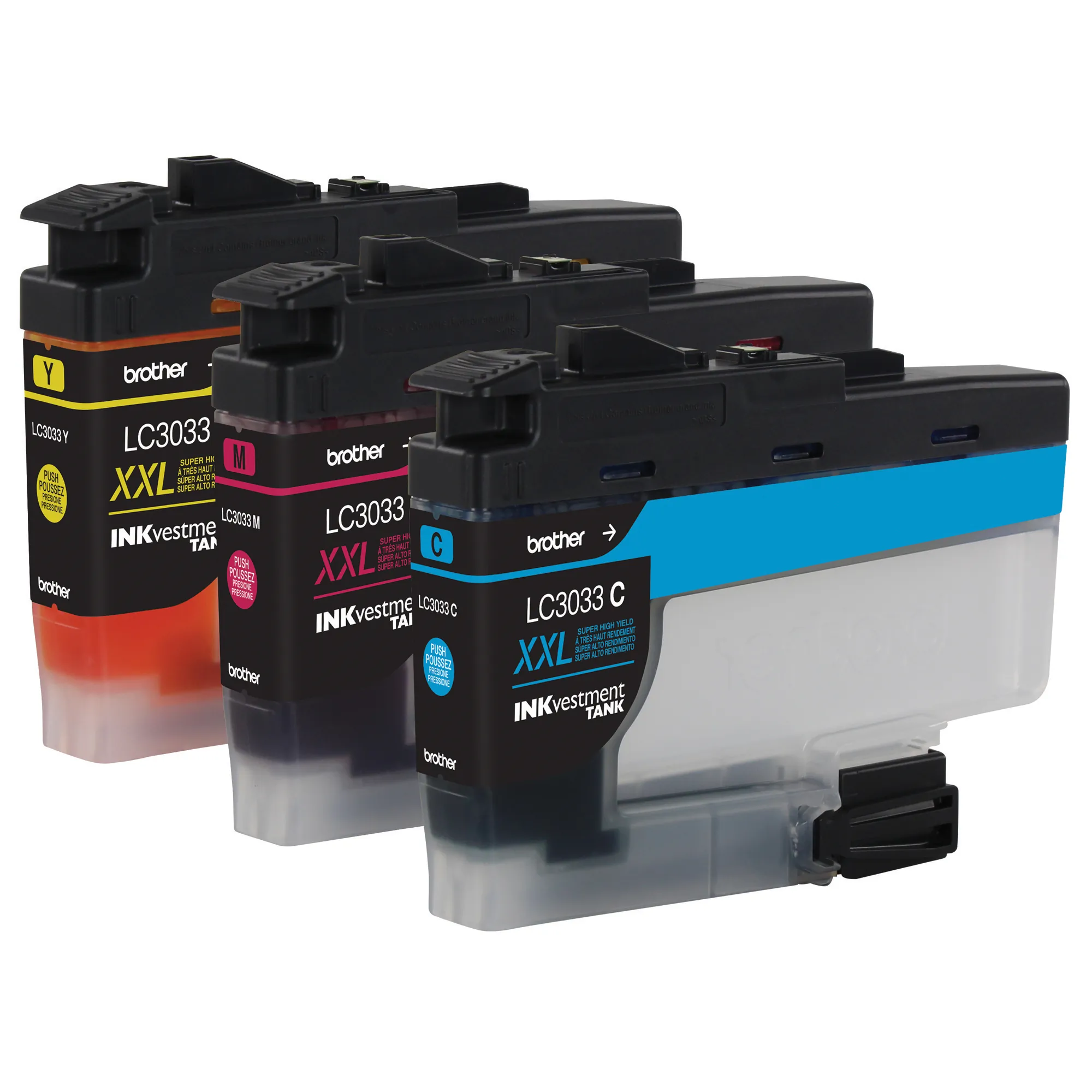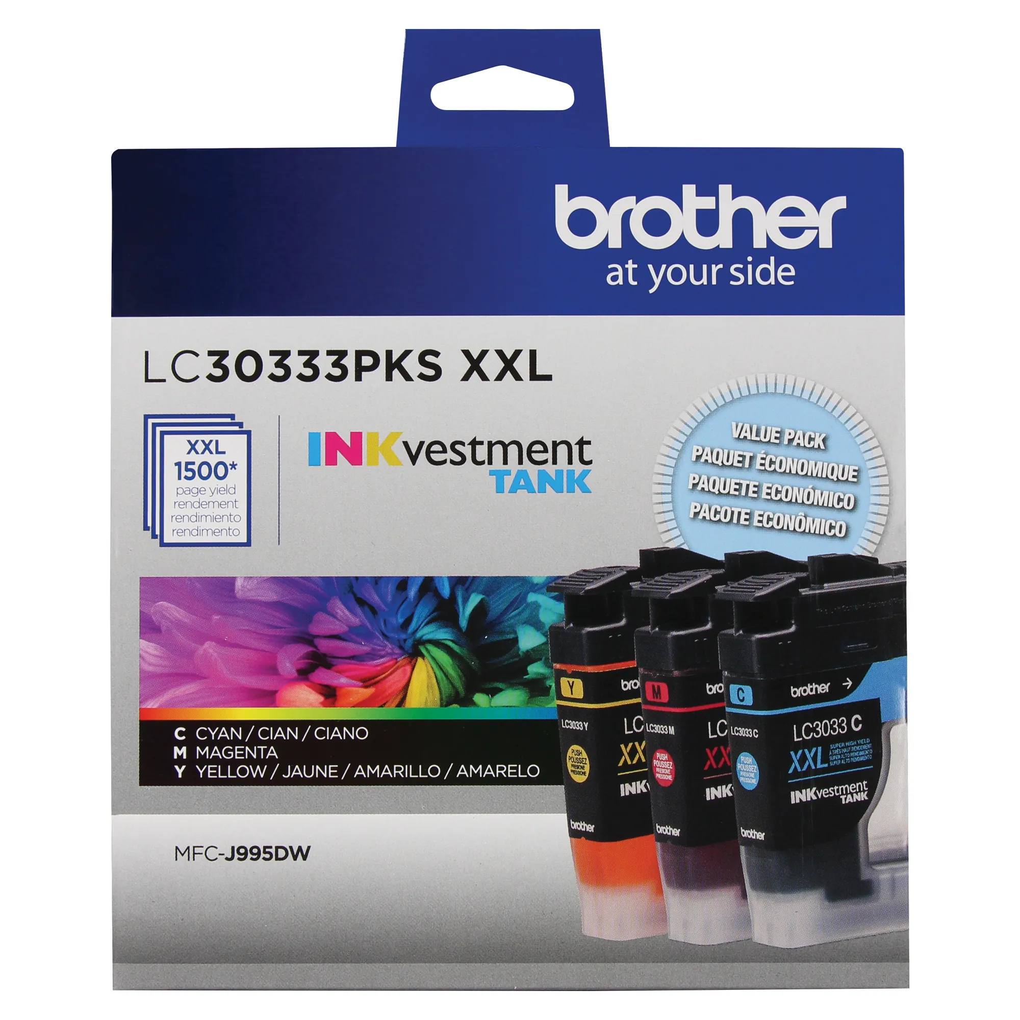 Brother Genuine LC30333PKS 3-Pack Super High-yield Color INKvestment Tank Ink Cartridges; includes 1 each of Cyan, Magenta and Yellow cartridges.Superior inkjet print quality you can consistently rely on for up to 1,500 pages/cartridge.*Intelligently engineered to work in seamless unison with your Brother INKvestment Tank inkjet printer.Brother Genuine ink produces rich, vivid color prints that withstand the test of time.Brother offers an environmentally responsible way for customers to dispose of Brother Genuine cartridges. Visit www.brother-usa.com/Environment to learn more.Brother Genuine LC30333PKS is for use with Brother INKvestment Tank, inkjet all-in-one printers MFC-J805DW, MFC-J805DWXL, MFC-J815DW XL, MFC-J995DW and MFC-J995DW XLthat feature Brother tank technology.*Approximate page yield in accordance with ISO/IEC 24711.
