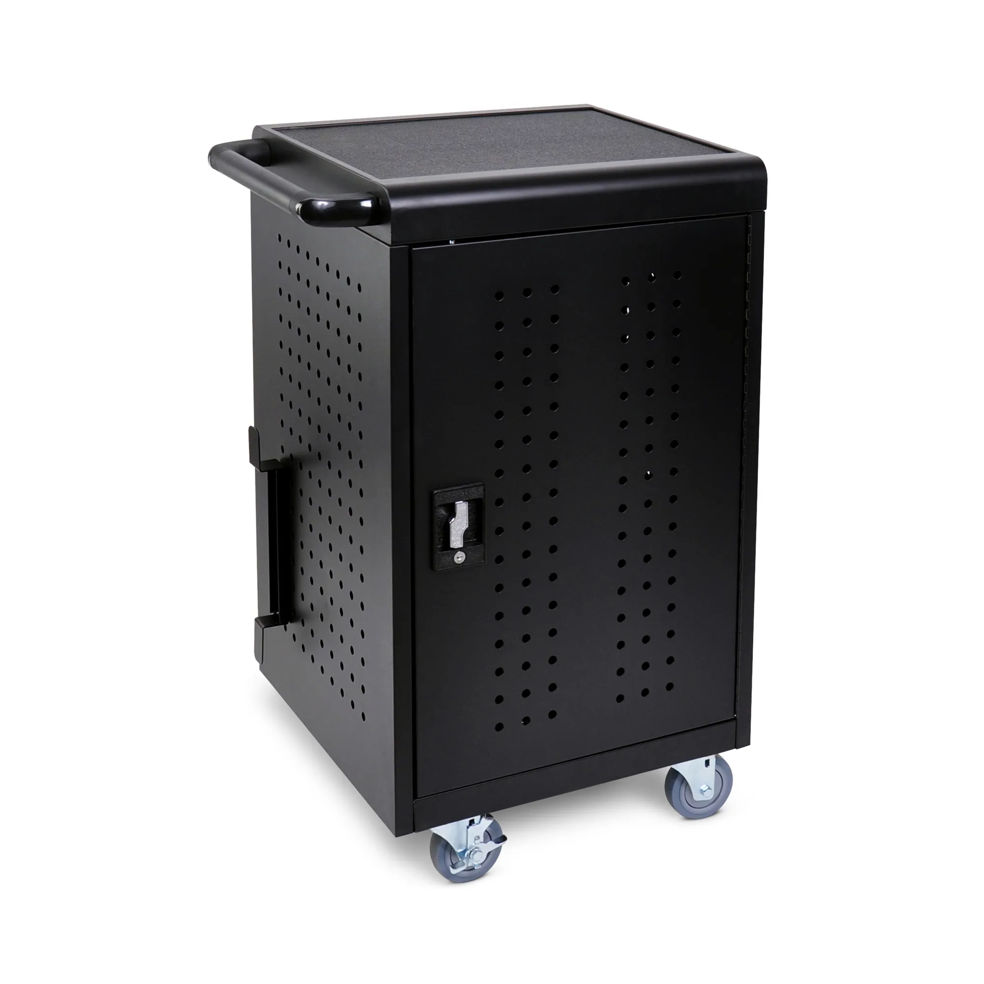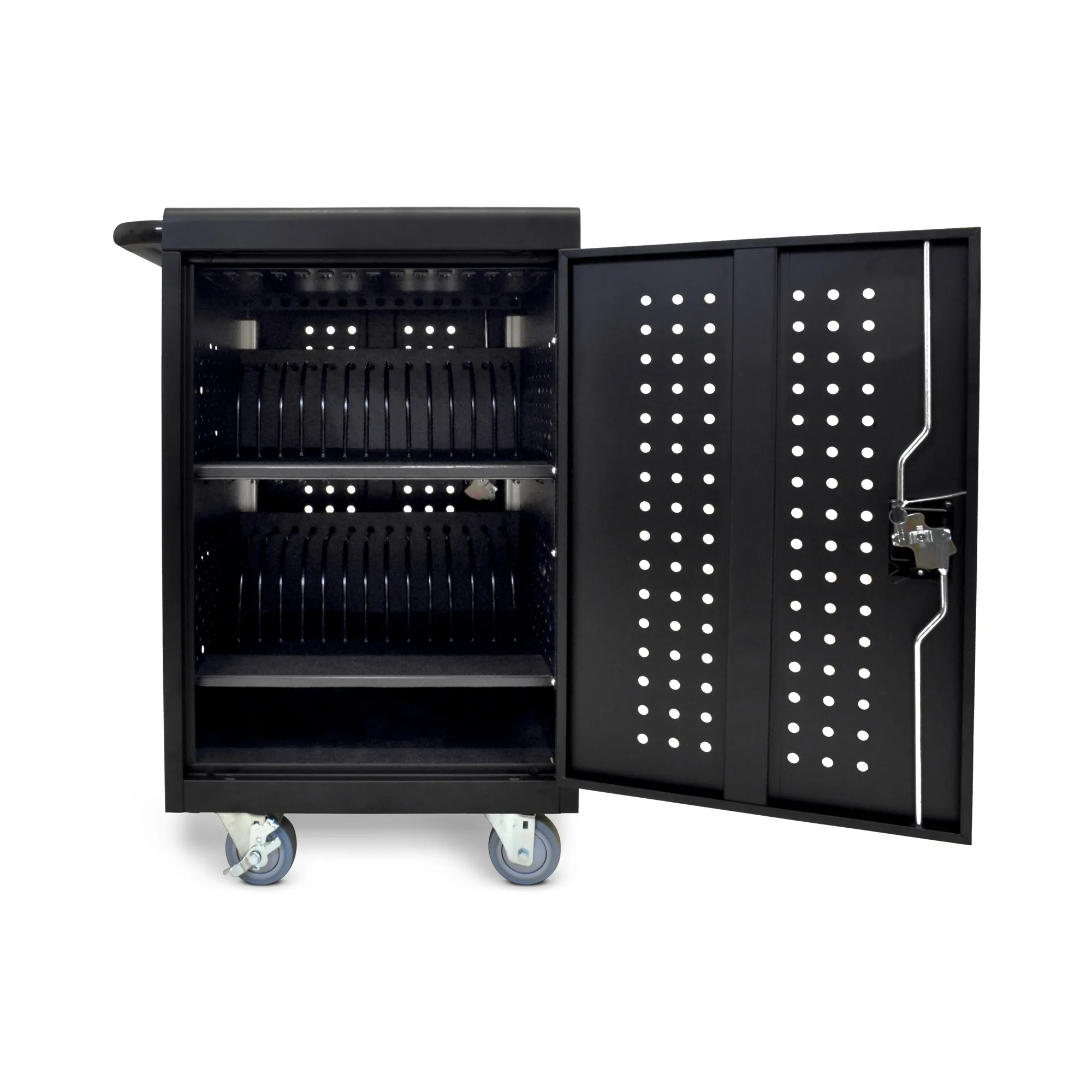 The Luxor Black 30-Device Tablet Charging Cart is designed to securely charge, store, and transport your tablets and Chromebooks, fulfilling the demands of modern classrooms and mobile workspaces. With robust lockable steel doors, this cart ensures the safety of your devices while neatly organizing wires and electrical connections.