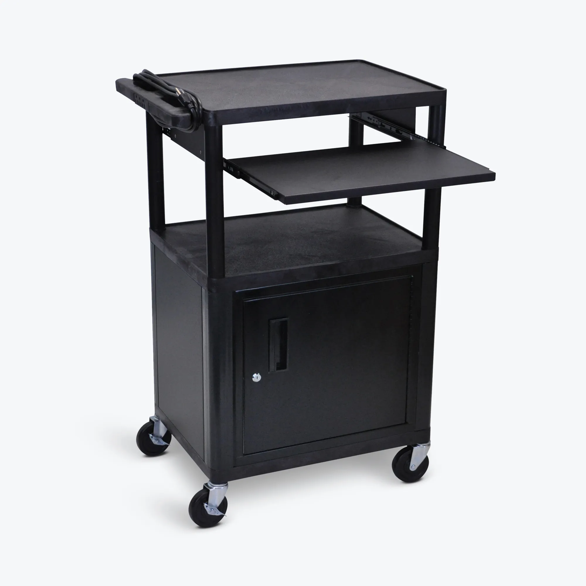 This heavy-duty AV cart is designed to support and transport up to 400 lbs. Constructed with high-density polyethylene plastic, the shelves feature a .25" retaining lip to keep items securely in place. The middle shelf offers 14" of clearance while the bottom shelf provides 17.75", allowing ample space for AV equipment and accessories.