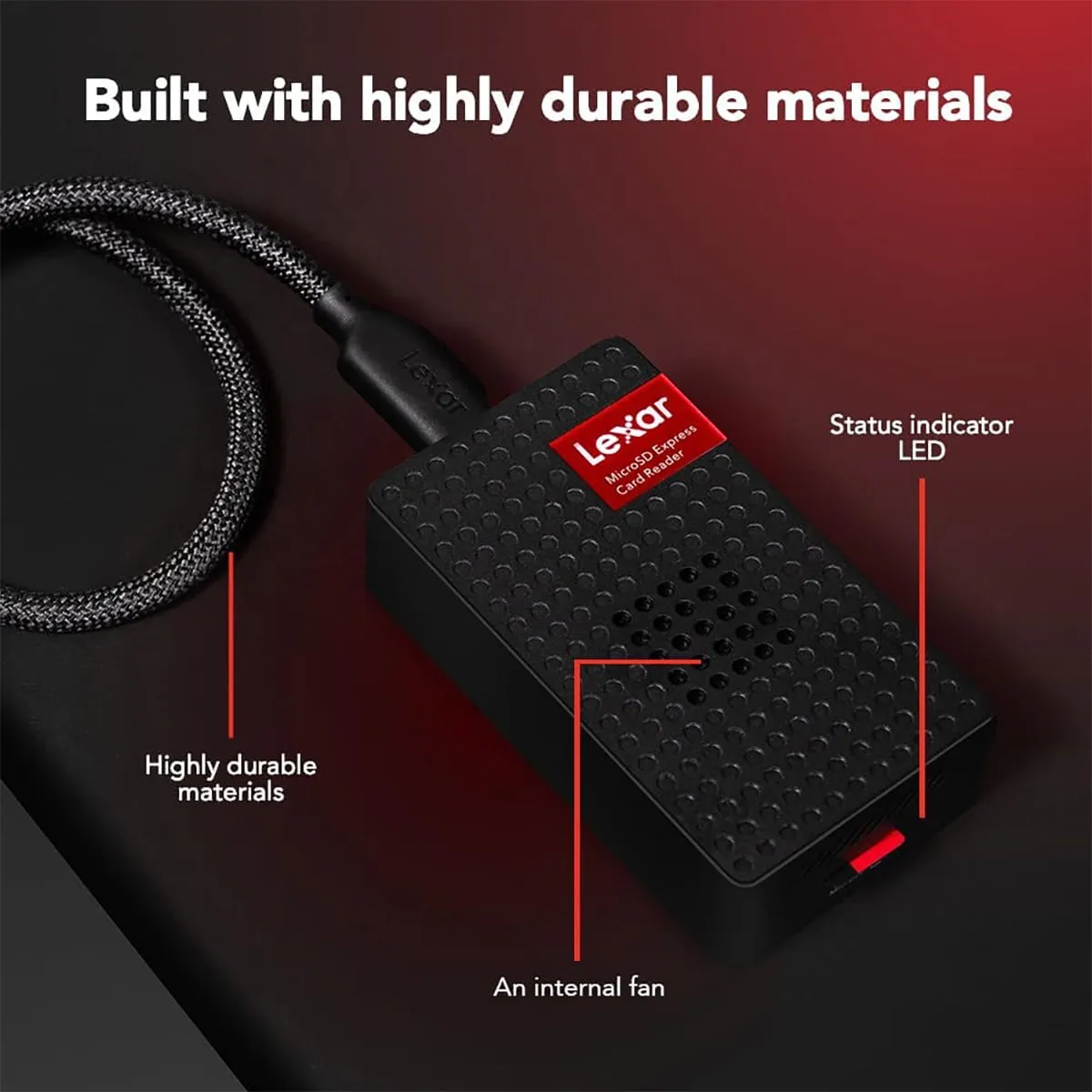 Transfer your data with the microSDXC Express Card Reader from Lexar. When paired with the Lexar PLAY PRO microSDXC Express Card, this USB-C 3.2 Gen 2 card reader can achieve transfer rates up to 900 Mb/s. The microSDXC port supports UHS-I cards and is compatible with UHS-II cards at UHS-I speeds. A built-in fan helps dissipate heat and can lower temperatures up to 66?F to ensure peak performance while working. A status LED indicator informs you when the card reader is powered on and transferring data. The included USB-C to USB-A adapter provides wide compatibility. Plug-and-play connectivity means that no additional drivers are required for use, and this card reader is compatible with Windows and macOS devices.