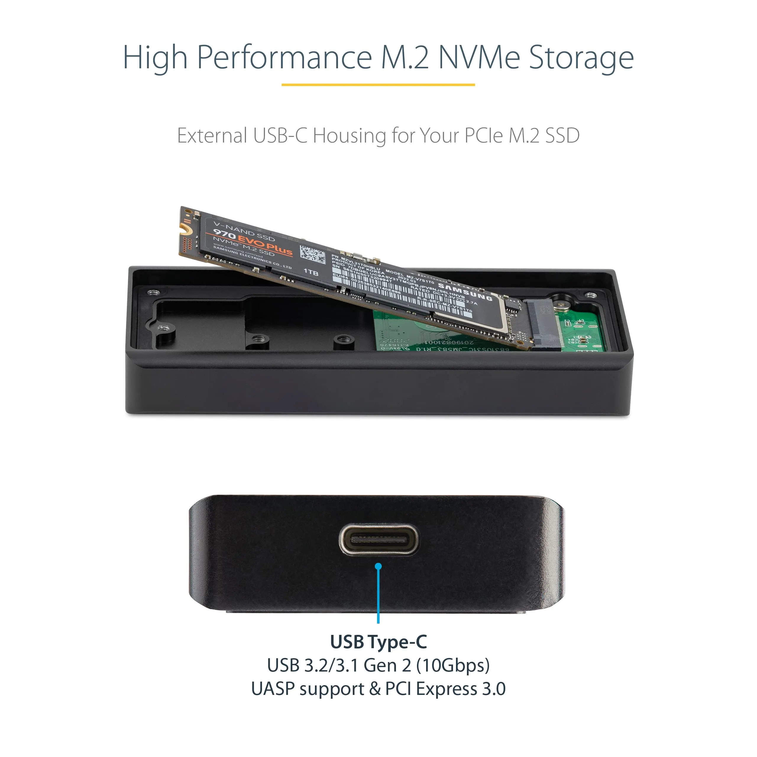 This rugged M.2 NVMe PCIe SSD Enclosure is a highly portable and high-performance data storage solution for your USB-C devices - The enclosure for PCI Express based NVMe SSDs comes with an IP67 rating which means that it's both dust and water resistant - The USB C M.2 NVMe enclosure delivers USB 3.1 Gen 2 read/write speeds up to 10Gbps which is nearly twice the capability of traditional SATA hard drive enclosures - The Rugged SSD Enclosure offers superior speeds which is ideal for data-migration