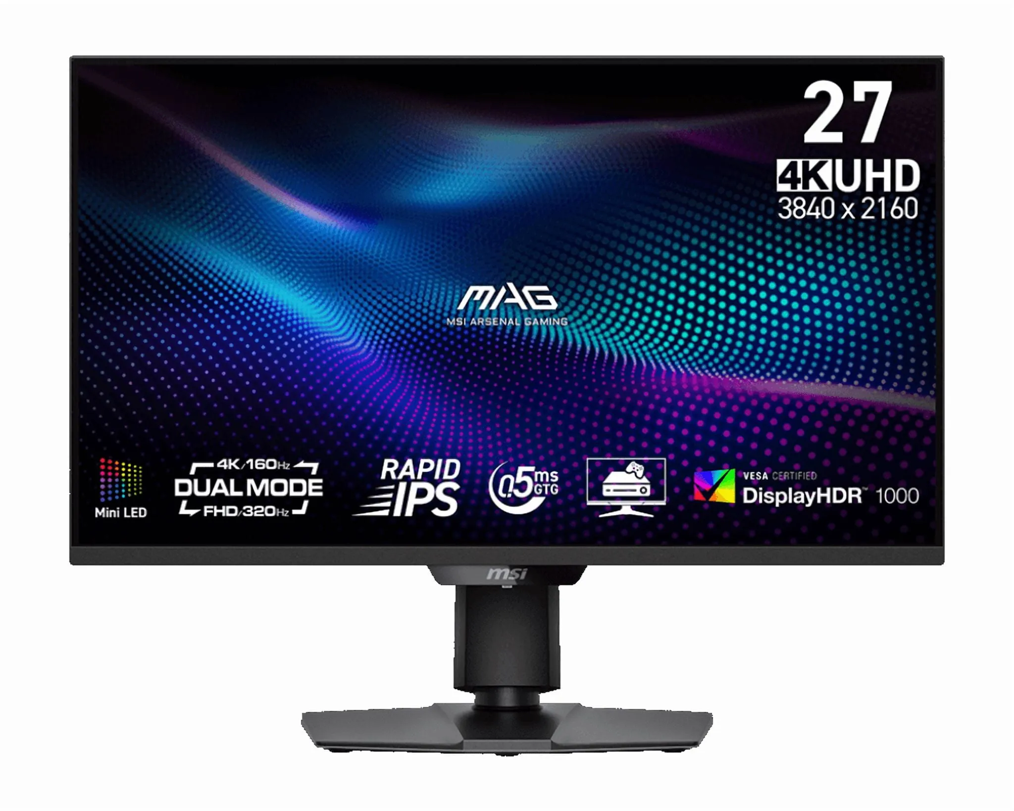 MAG 274UPDF E16M Flat Gaming Monitor, Metallic Black w/ Glassy Black Trim, 27" screen, Rapid IPS with mini-LED (1152 zones), 2560x1440 QHD Resolution, Adaptive Sync, HDR 1000, non-Glare with narrow bezel, 160Hz UHD/320Hz FHD Refresh Rate, Tilt, Swivel, Height and Pivot Adjustable