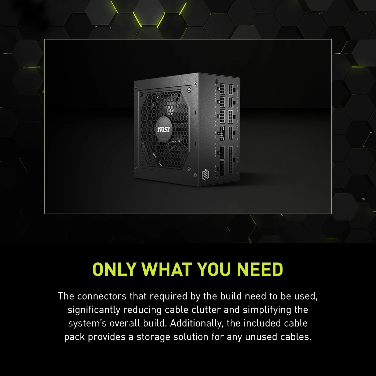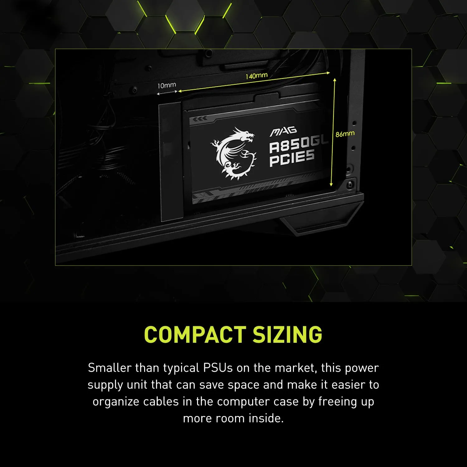The MSI MAG A850GL is a high-performance power supply that is fully compatible with ATX 3.0 standards and features a native PCIe 5.0 connector. Designed to support NVIDIA GeForce RTX 40 Series graphics cards, this fully modular PSU comes with flat cables for easy cable management.