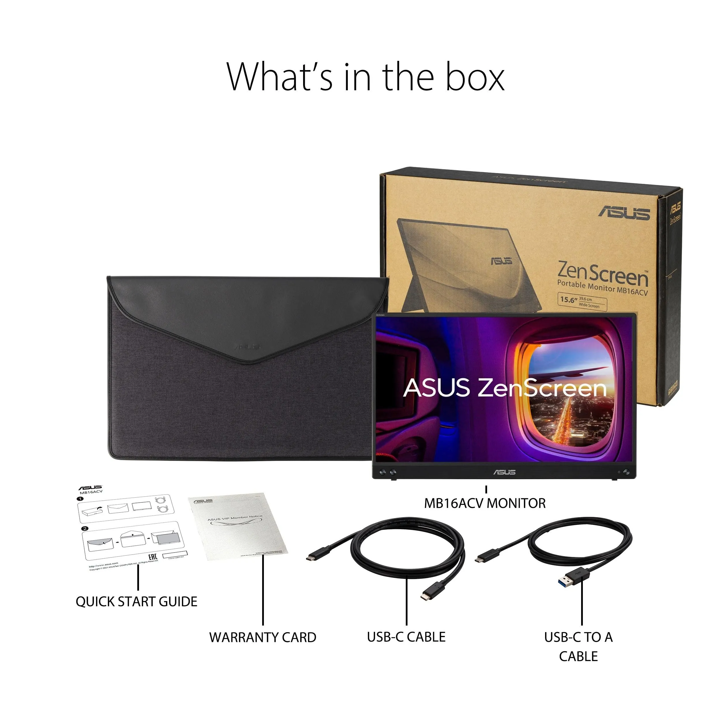 The ASUS ZenScreen MB16ACVR is a 15.6-inch portable USB monitor designed for on-the-go productivity. Featuring a Full HD IPS display with a resolution of 1920 x 1080, it provides vibrant colors and wide viewing angles. This monitor supports a hybrid signal solution, allowing for connections via USB Type-C, making it compatible with various devices. Its flicker-free technology and blue light filter help reduce eye strain during extended use, while the anti-glare surface ensures comfortable viewing in different lighting conditions. Additionally, the monitor has an antibacterial treatment, enhancing hygiene and safety during use.