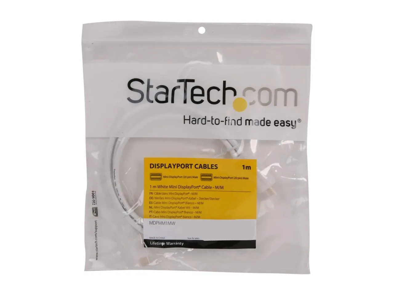 3.3ft (1m) White Mini DisplayPort Cable (Mini DP 1.2); 4Kx2K video (3840x2400p 60Hz); 21.6 Gbps/HBR2/8Ch Audio/MST - Durable PVC strain relief - mDP Cord works w/laptop (Thunderbolt 2 or Mini-DP port)/workstations and monitor/display; MacBook Pro/Air General Information Manufacturer: StarTech.com Manufacturer Part Number: MDPMM1MW Brand Name: StarTech.com Product Name: 1m (3 ft) White Mini DisplayPort 1.2 Cable M/M - Mini DisplayPort 4k Marketing Information: The MDPMM1MW 1m White Mini DisplayPort 1.2 cable features 2 Mini DP male connectors, and offers a dependable solution for connecting any Mini DisplayPort-enabled laptop (including Mac family of products) to a Mini DisplayPort-equipped monitor. The mDP cable supports high resolutions of up to 4k x 2k (3840 x 2160) @ 60Hz with a maximum HBR2 bandwidth of 21.6 Gbps. The cable also supports Multi-Stream (MST) for daisy chaining multiple monitors and provides optional audio support. The MDPMM1MW is backed by StarTech.com's Lifetime Warranty, for guaranteed reliability and ensures that digitally protected content is displayed properly, with both HDCP and DPCP capability. Please note: Newer laptop and desktop computers (e.g. Apple) come equipped with Thunderbolt ports only. Our Mini DisplayPort Cables can be connected to the Thunderbolt ports, enabling you to connect your Mini DP compatible displays. >More from the Manufacturer Packaged Quantity: 1 Product Type: Video Cable Technical Information Cable Type: Mini DisplayPort Cable Length: 3.28 ft Connector Type on First End: Mini DisplayPort 1.2 Digital Audio/Video - Male Connector on First End Details: 1 x 20-pin Mini DisplayPort 1.2 Digital Audio/Video - Male Connector Type on Second End: Mini DisplayPort 1.2 Digital Audio/Video - Male Connector on Second End Details: 1 x 20-pin Mini DisplayPort 1.2 Digital Audio/Video - Male Connector Plating: Gold Features: EMI Protection Features: Fray Resistant Features: HDCP Features: Bendable Features: Damage Resistant Features: DPCP Features: Multi-Stream Transport (MST) Support Features: Strain Relief Conductor: Copper Shielding: Yes Jacket Type: CMG Device Supported: MacBook Air Device Supported: MacBook Pro Device Supported: Audio/Video Device Device Supported: Desktop Computer Device Supported: Monitor Device Supported: Notebook Device Supported: Projector American Wire Gauge: 30 AWG Supported Resolution: 2560 x 1600 Physical Characteristics Product Color: White Jacket Material: Polyvinyl Chloride (PVC) Weight (Approximate): 0.04 lb Miscellaneous Additional Information: High quality cable design and construction offers a dependable replacement for worn out or faulty Mini DisplayPort cablesWhite cable color is well suited for connecting Apple devicesBacked by a StarTech.com lifetime warranty Environmentally Friendly: Yes Environmental Certification: RoHS Country of Origin: China Warranty Limited Warranty: Lifetime