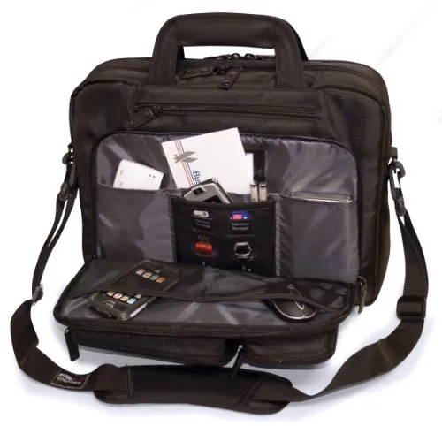 The Corporate Laptop Briefcase is the perfect carry-all solution for road-warriors, business commuters and students! The padded computer compartment is designed to hold all your computing devices in one area! Your 16” laptop, a sleek Chromebook / Ultrabook and/or a tablet or e-reader all fit in this section with their own, separate padded pockets! On the front of the case, you’ll find a zip-down workstation with pockets for business cards, USB drives, memory cards, cell phones and your personal items, plus a separate pocket for plane tickets of travel documents. The case also features three exterior quick-access padded pockets to store and organize your power supply, mouse and other accessories. A separate accordion file section provides ample space for your work papers, files and magazines.
