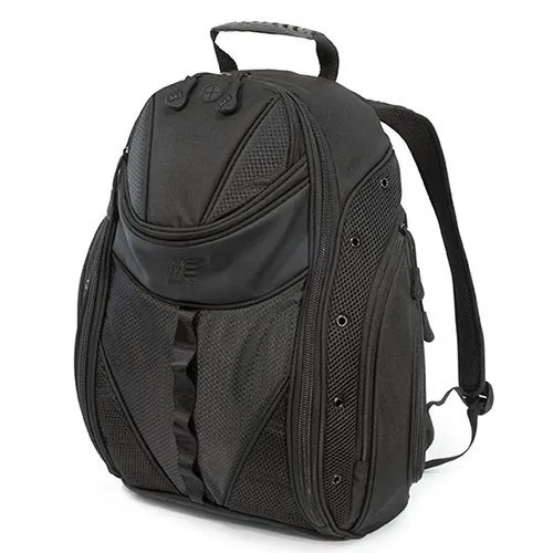 Protective Laptop Compartment Holds Up To 16 In. Laptops Roomy Interior With Pockets For CDs, Mp3 Player, Keys, And Accessories Dedicated Media/Phone Pocket For Mp3 Player Or Srmartphone With Headphone Pass-Through Ergonomic Ventilated Back Panel For Superior Comfort Integrated iPad/Tablet Compartment Heavy-Duty Duraflex Fittings Exterior Water Bottle Pocket Black