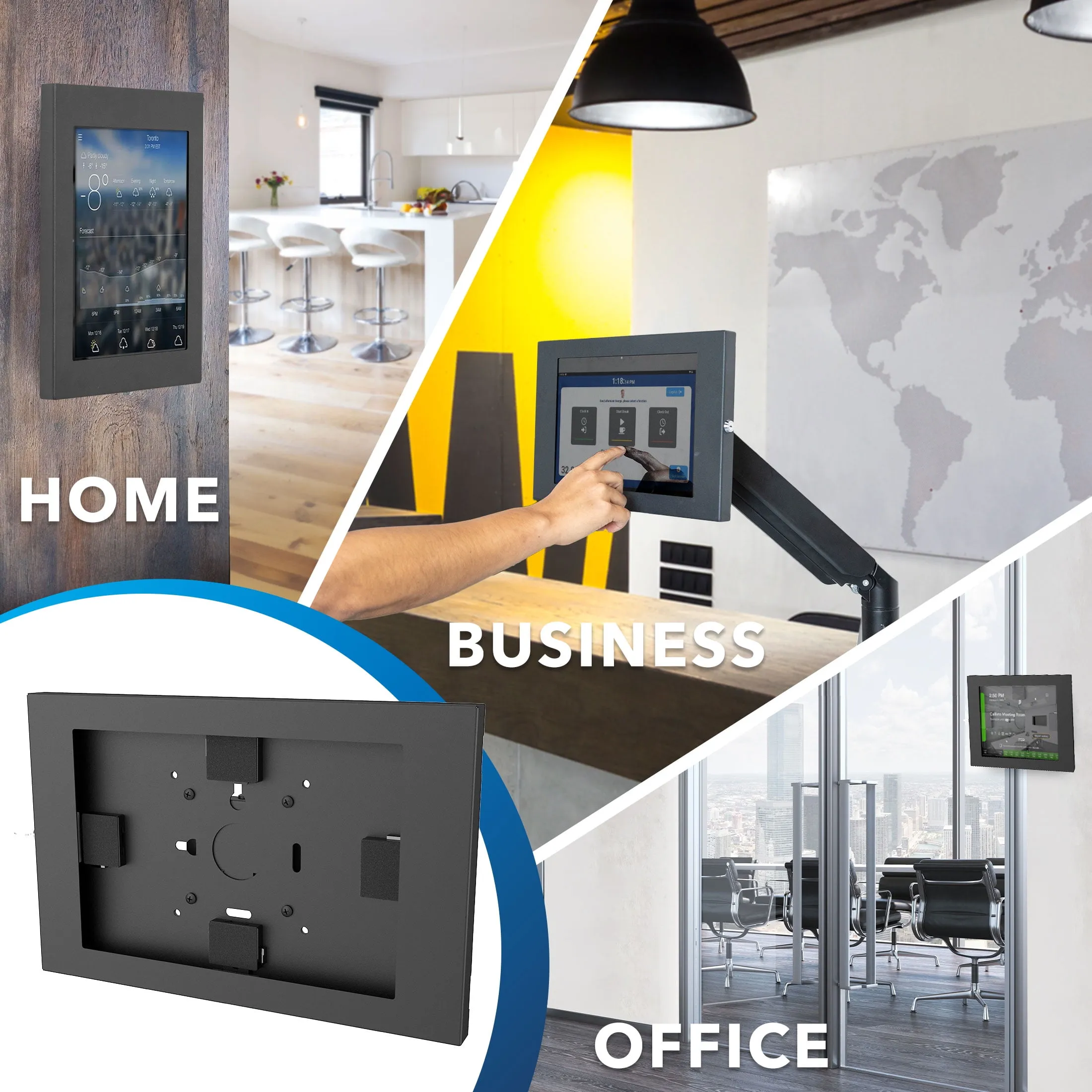 The mount can be installed flush against the wall for a sleek, low-profile appearance or attached to any VESA-compatible stand for versatile positioning. Constructed from high-strength steel, it promises long-lasting performance and is ideal for interactive displays, point-of-sale systems, and self-service kiosks.
