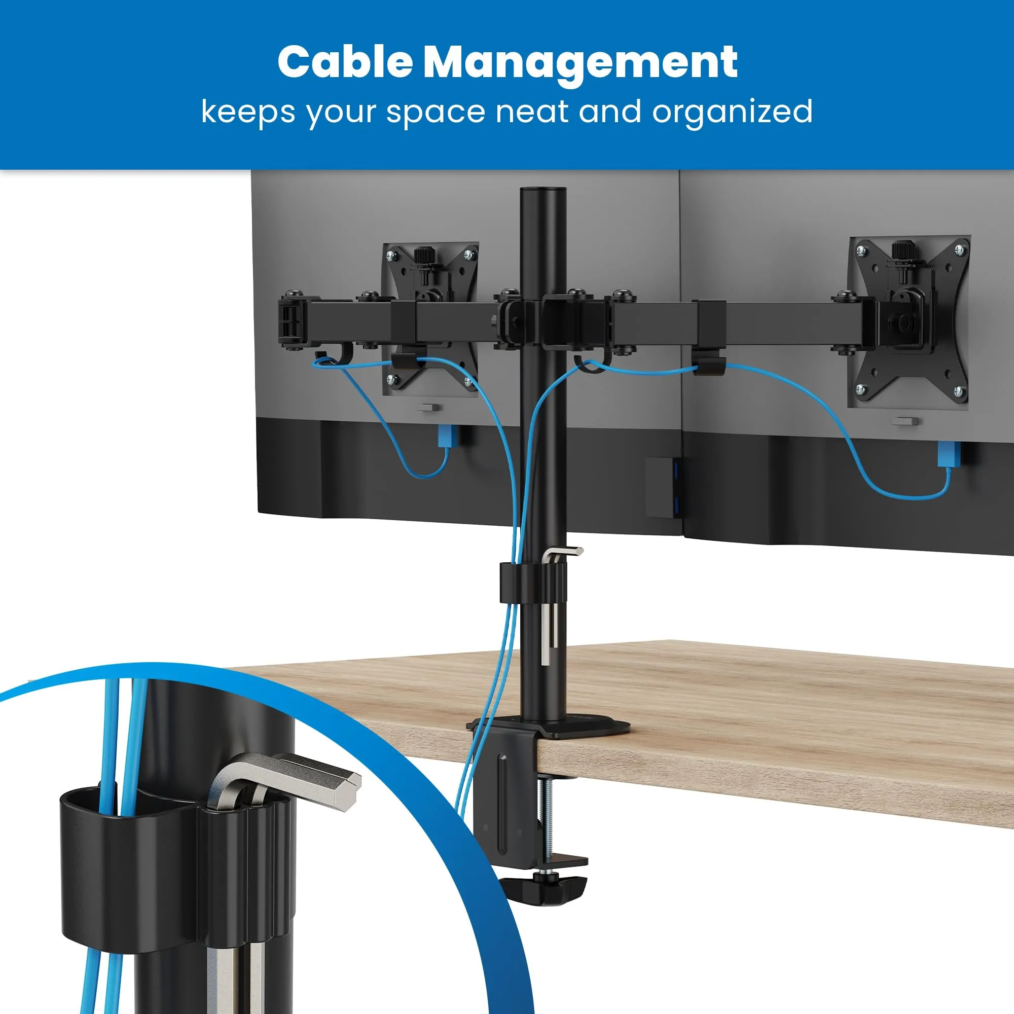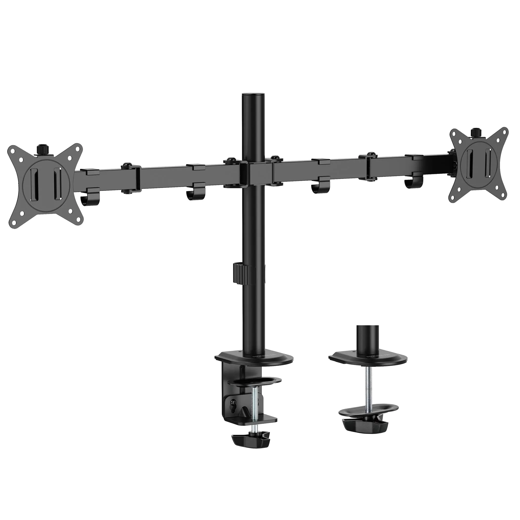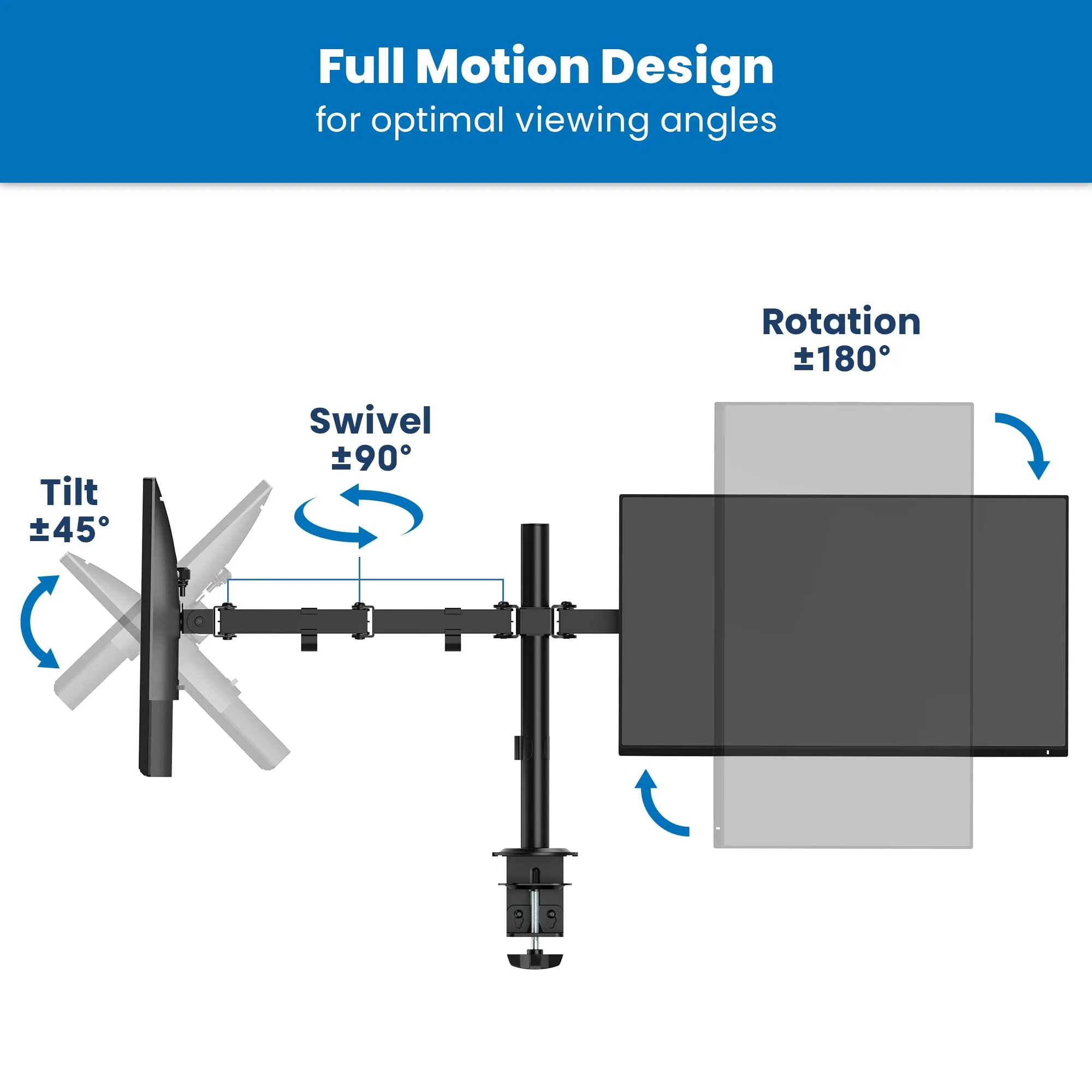 Enhance your productivity with our Dual Monitor Mount, designed to improve ergonomic screen positioning. Its full-motion capabilities, including swivel, tilt, and extension, allow you to achieve the perfect side-by-side setup for your screens.