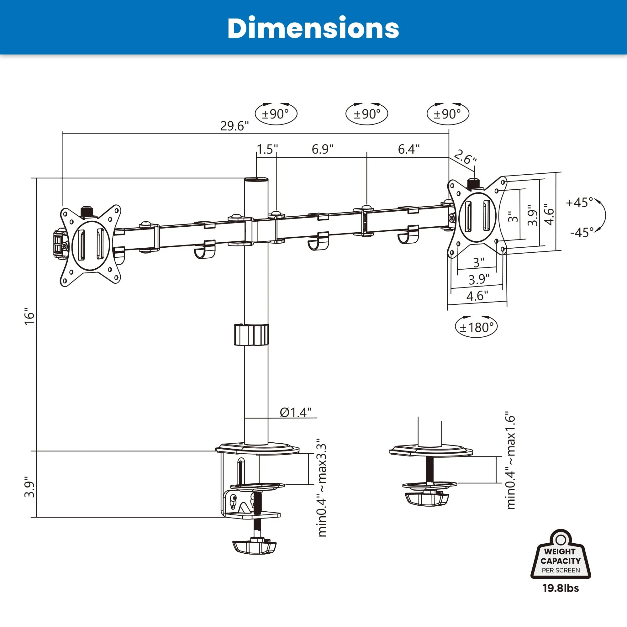This sturdy mount holds monitors up to 32" in size and 19.8 lbs each, providing a reliable solution for your display needs. Enjoy landscape and portrait orientation options, tailoring the setup to meet your specific viewing preferences.