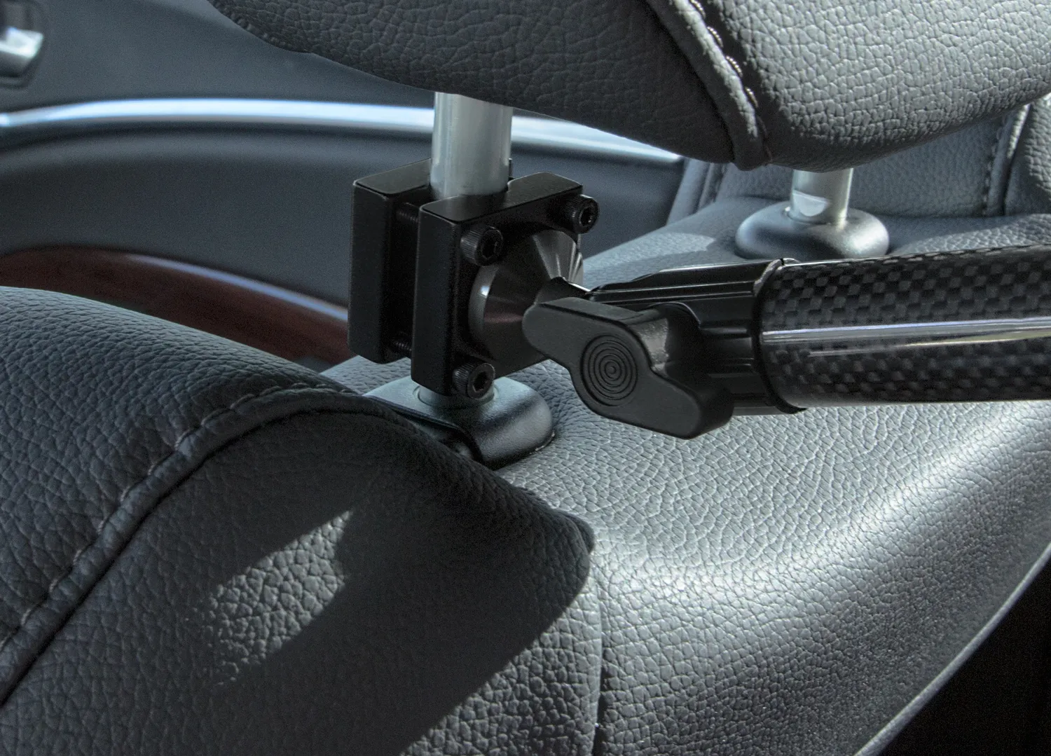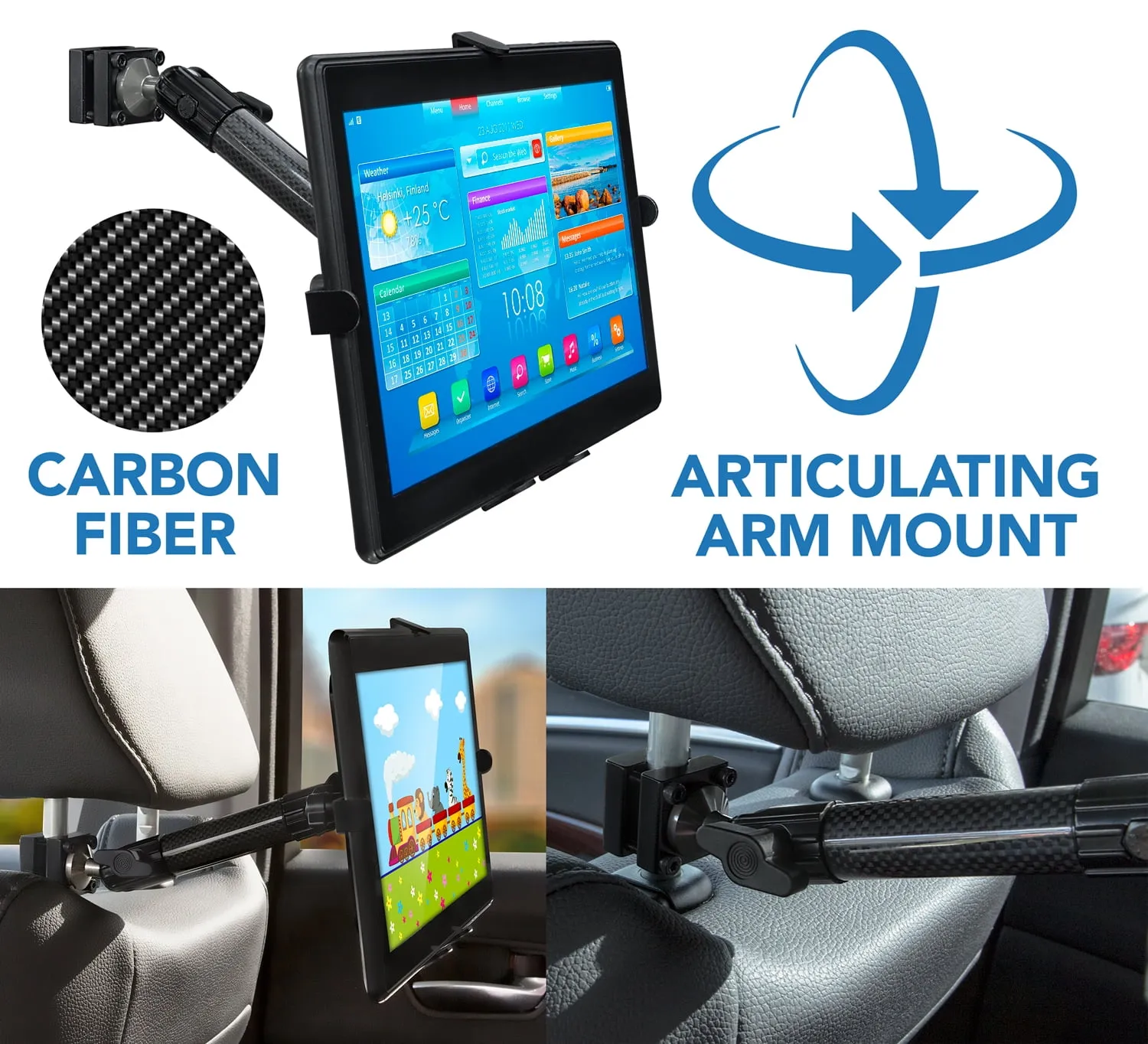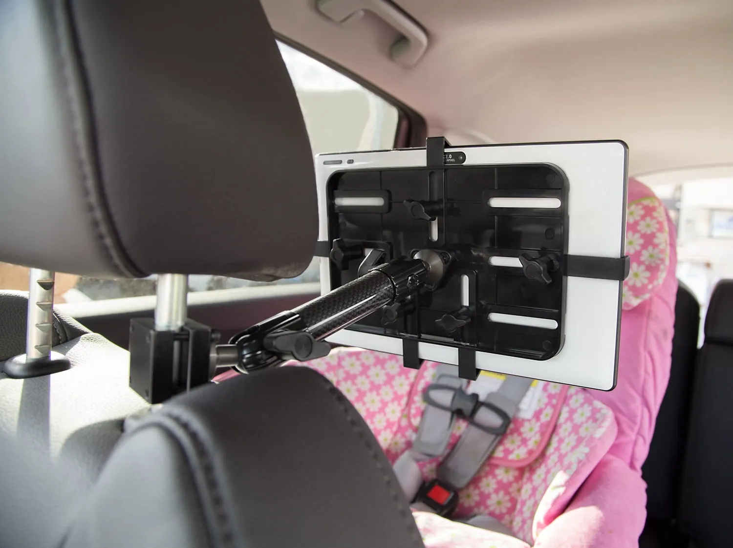This innovative rear-facing carbon fiber tablet holder allows your passengers to easily watch, play, and interact with their devices from the back seat.