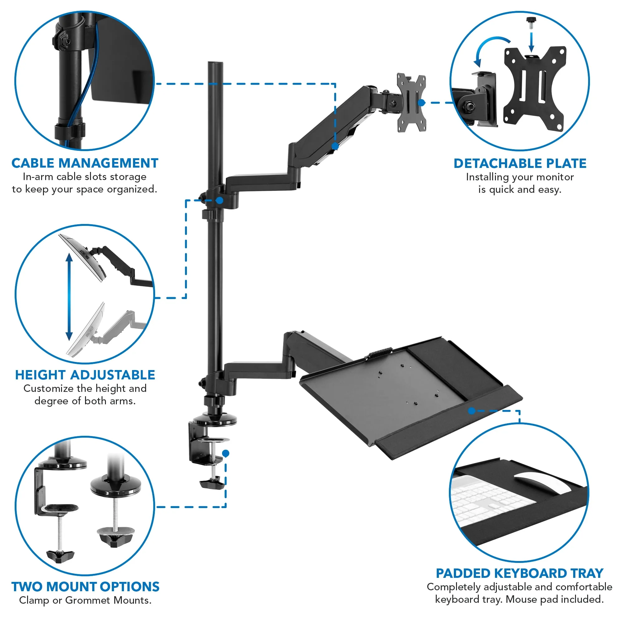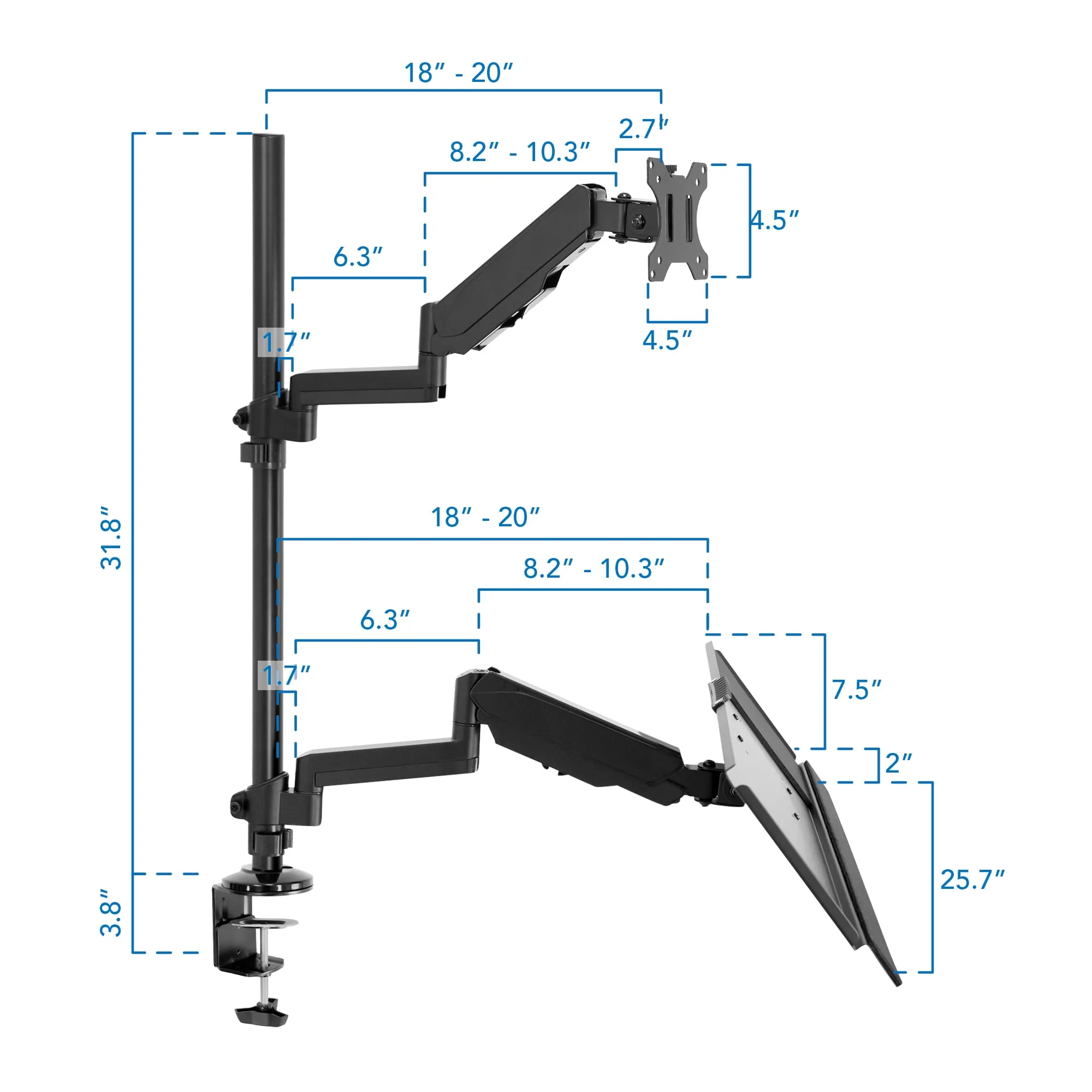 Elevate your workspace with the MI Dual Monitor Desktop Mount. Designed to accommodate screens up to 32 inches, this mount allows for versatile positioning in both portrait and landscape orientations. The 25.7" x 9.5" keyboard tray features a comfortable padded wrist rest to reduce strain during long hours of use.