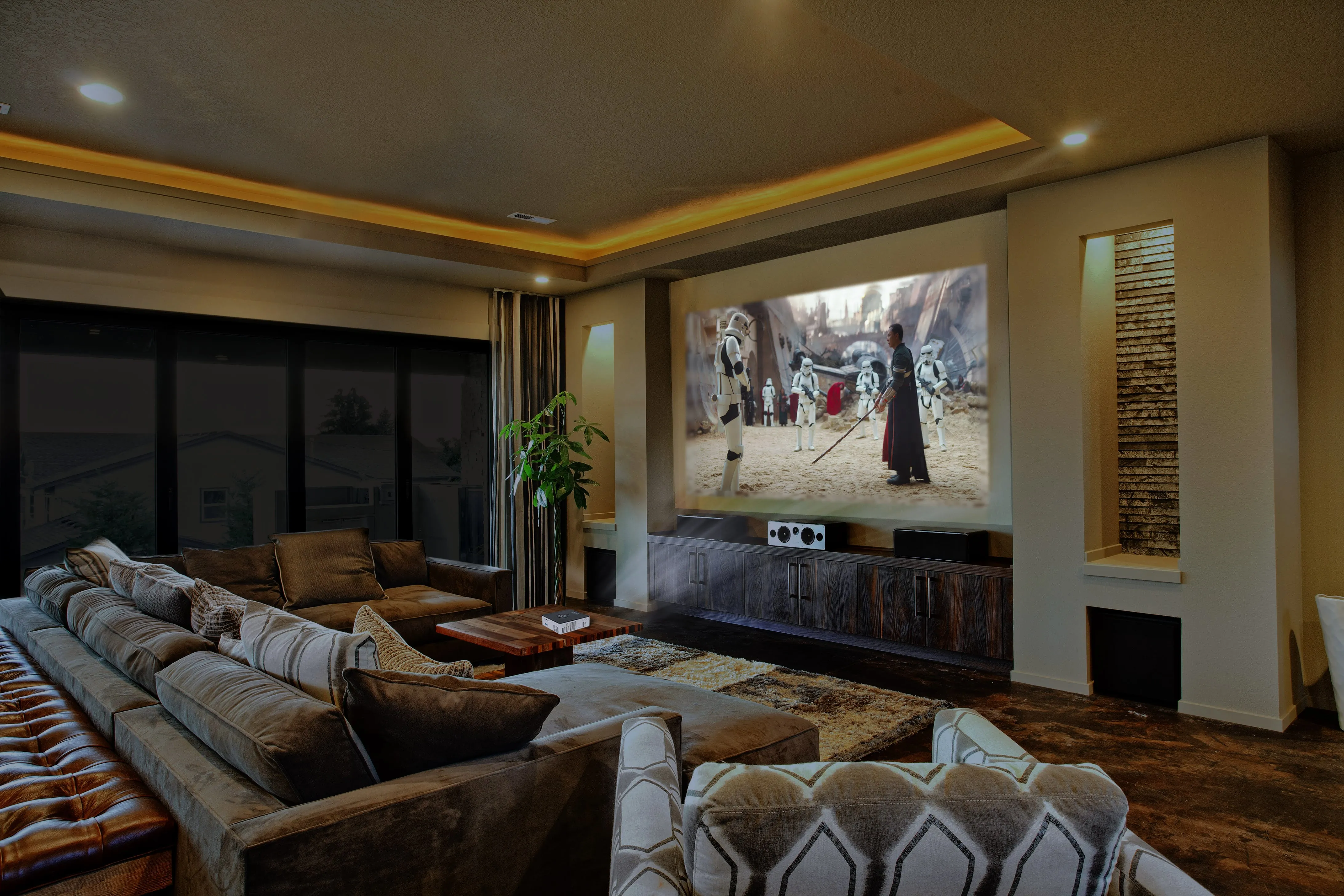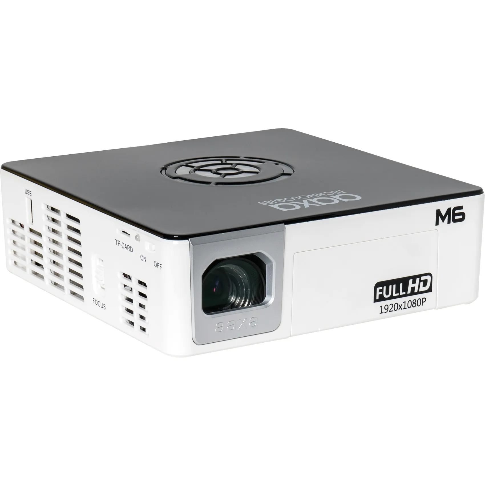 True Native 1080p HD Resolution The M6 Full HD projector delivers true native 1080P resolution without upscaling, pixel rotation, or other gimmicks found in many of the projectors claiming 1080P performance but often employing much lower resolution imagers sometimes even with just 1/10 of the claimed pixels. Other projectors may use a low cost 1080P LCD imager but with a low quality lens that cannot achieve 1080P on-screen resolution. The AAXA M6 features a Texas Instruments DLP native 1080P imager with a premium 1080P optical system designed to achieve the best on-screen resolution in the smallest possible form-factor. Anytime, Anywhere Battery Projection The M6 measures just 7? x 7? x 2.1? and includes a built-in 90 minute Premium Grade Lithium Ion battery. Combined with durable solid-state LEDs the M6 is built to withstand the rigors of mobile environments. The High Performance LEDs also enable the M6 to consume very little power while delivering 1200 LED Lumens of brightness (500 LED Lumens in battery mode) ? making the M6 an ultra-portable, lightweight, and anytime, anywhere projection projector. Cinema Color Quality with 30,000 Hour LED Light Source The M6 employs advanced solid-state LED lighting technology. The direct projection of Red, Green, and Blue eliminates the need for filters and color-wheels that are typically found in lamp-based projectors. The resulting cinema-color quality picture is vibrant, sharp, and stunning. The high performance LEDs are able to produce an astounding 1200 LED Lumens of brightness allowing 200? movies to be projected in dark areas, lasts up to 30,000 Hours, and doesn?t contain the environmentally damaging mercury found in lamp-based projectors. Onboard Media Player The M6 micro projector features an onboard media player capable of directly playing videos, pictures, and music through a USB stick or micro TF card. With an onboard speaker and battery the M6 is a true all-in-one entertainment projector. Additional connectivity features includes HDMI compatibility, VGA connector, AV port, and 3.5mm headphone port.