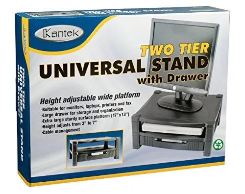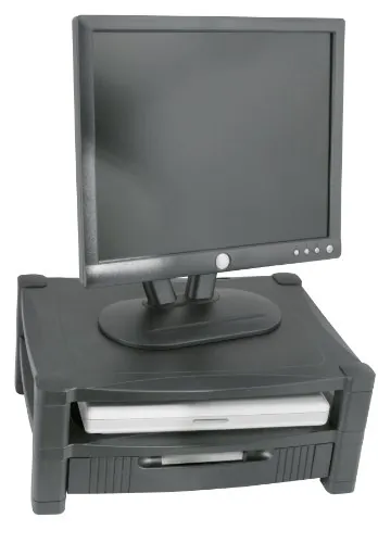 Two-Level Monitor Stand with drawer adjusts in height from 3" to 6-1/2" in 1-1/4" increments. Offers extra-large 17" x 13-1/4" sturdy platform. Wide design suitable to dock or support today's larger laptop computers. Maximizes work space while raising your monitor or laptop to a comfortable viewing level. 4 USB Hub to attach all your USB peripherals. Includes removable drawer to organize your paper, supplies, files and more. Cable management.